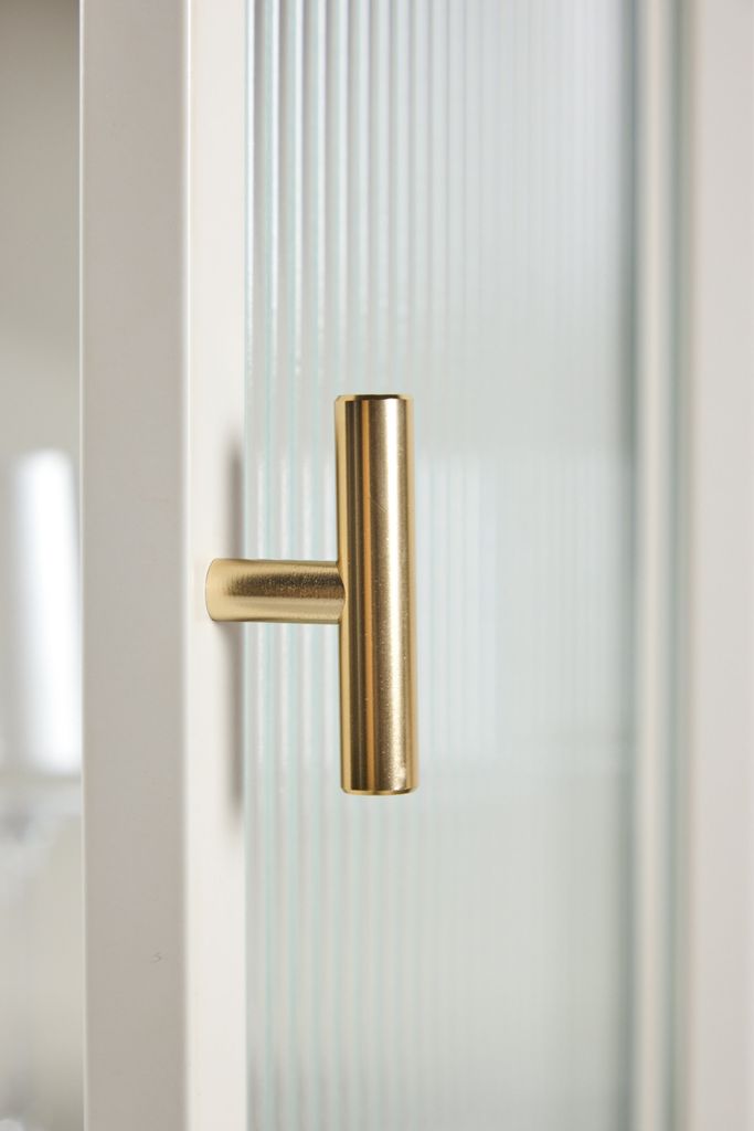 Skåpet erbjuder rikligt med förvaringsutrymme med sina två medföljande hyllplan, idealiskt för att visa upp dina vackra porslins- eller dekorationsföremål. De stilrena handtagen i mässing ger en elegant touch och fulländar det estetiska intrycket.
