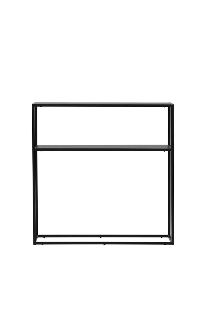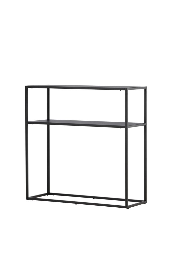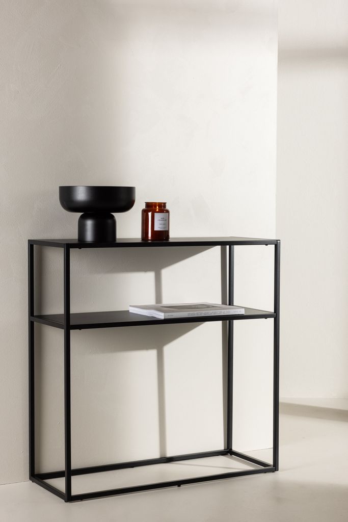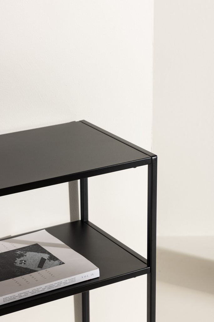 Elegant och funktionellt sidobord i svart stål med extra hyllplan för optimal förvaring.