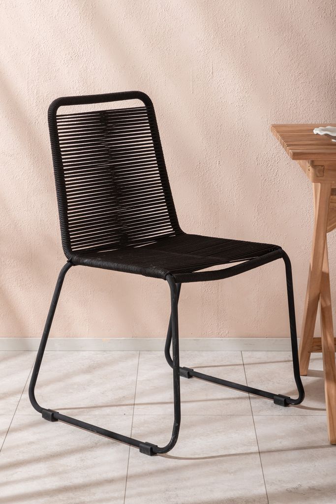 Till bordet medföljer våra omtyckta Lindos-stolar, som är stapelbara och har en robust ram i svart aluminium. Sitsen är gjord av svart rep, vilket ger både komfort och stil. Denna kombination skapar ett inbjudande blickfång som passar perfekt i en modern utomhusmiljö.