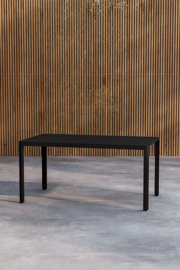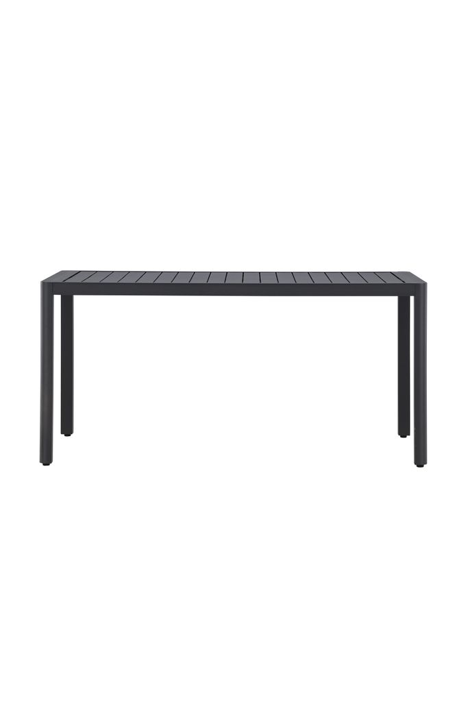 Modernt matbord i svart aluminium, perfekt för utomhusbruk. Rektangulär form och ribbad yta.