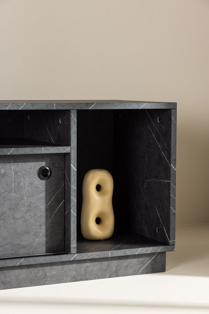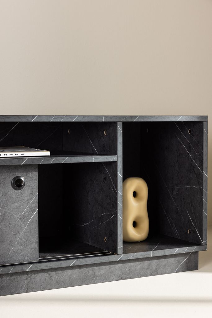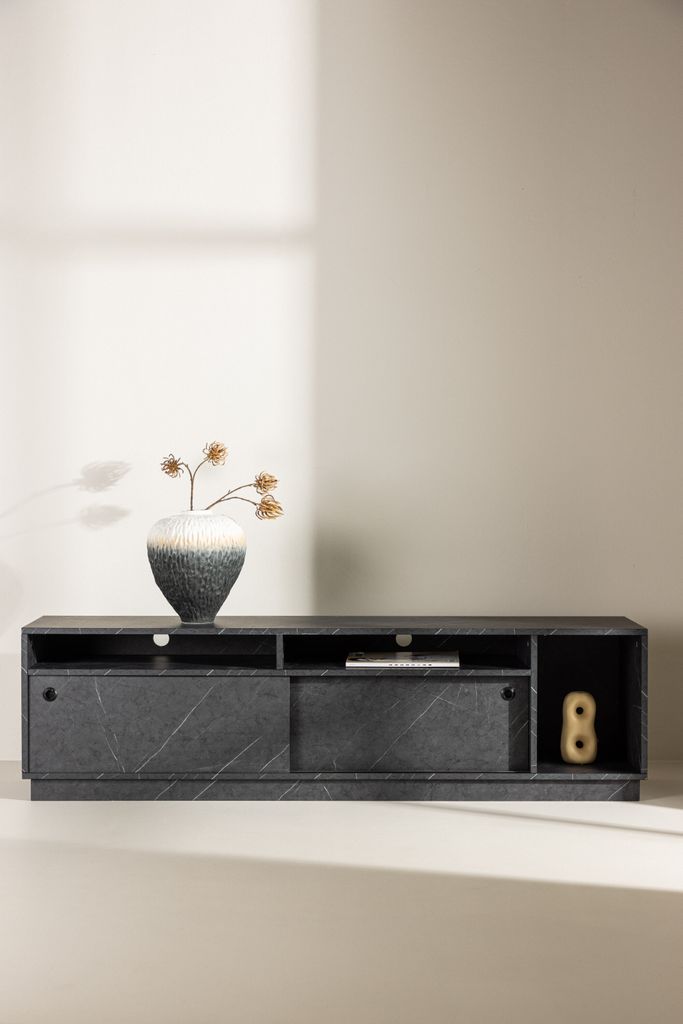 Toppskivan är idealisk för att placera dekorativa element som ljusstakar eller högtalare, vilket skapar en inbjudande atmosfär och förbättrar din TV-upplevelse. Den svarta ytan med subtila marmoreringar ger en lyxig känsla som passar i alla moderna hem.