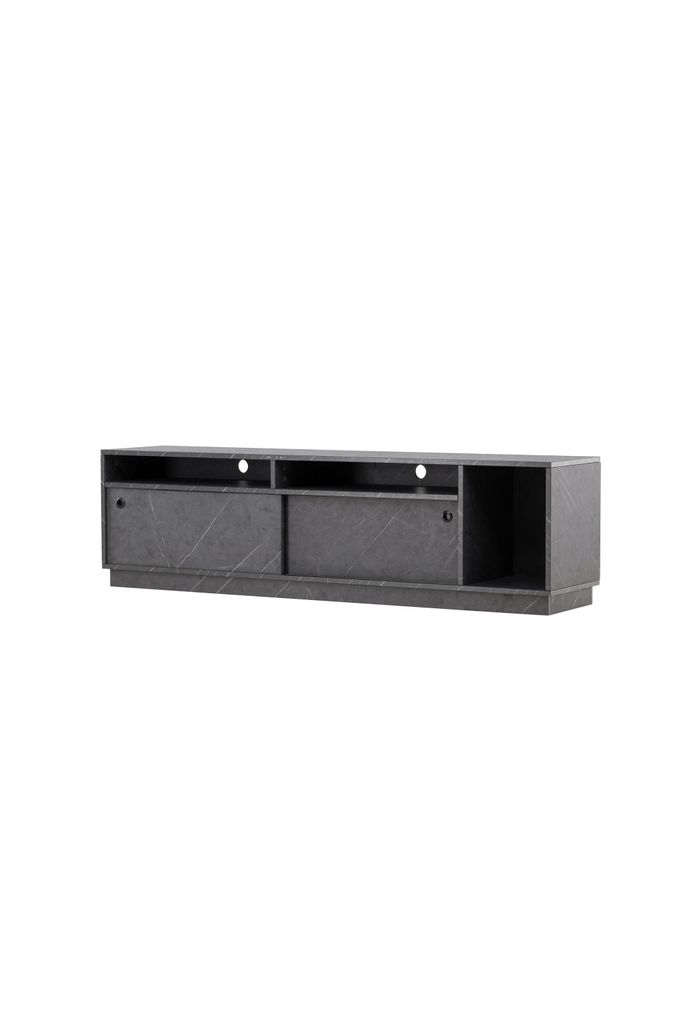 Med två smidiga skjutdörrar döljer den ett rymligt hyllplan där du enkelt kan förvara dina enheter, kablar och fjärrkontroller. De öppna hyllfacken ger dig möjligheten att visa upp dina favoritprylar och ge ditt hem en personlig touch.