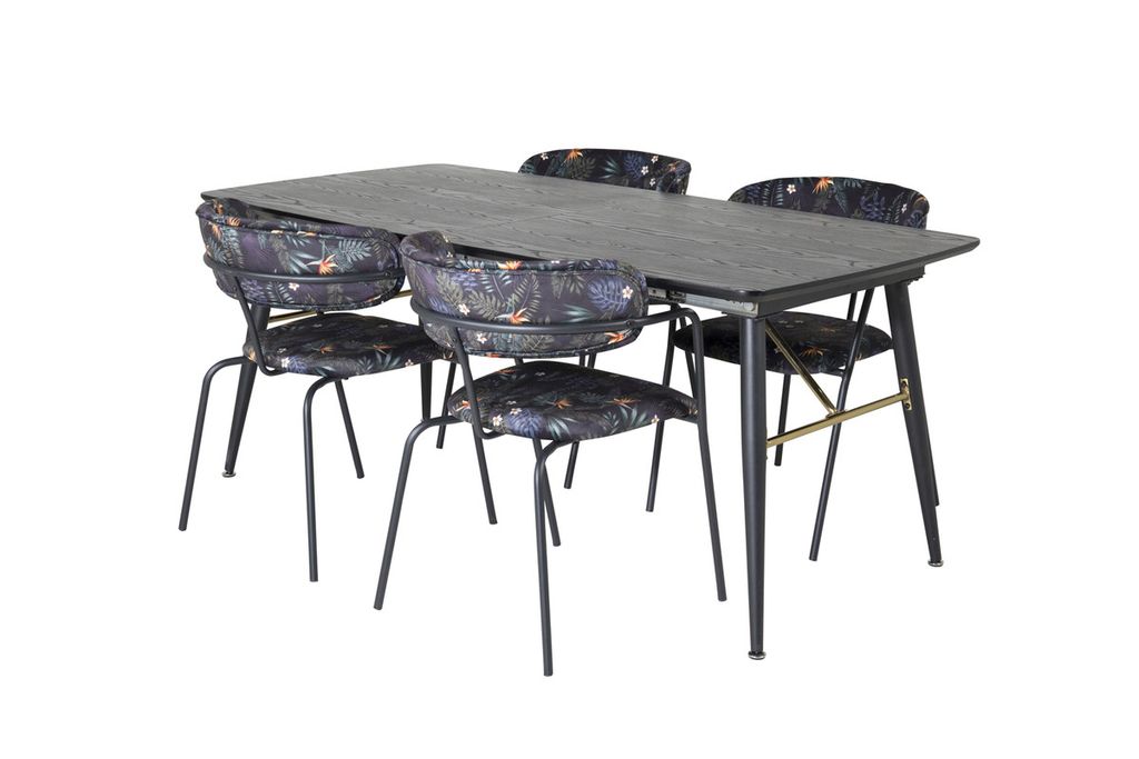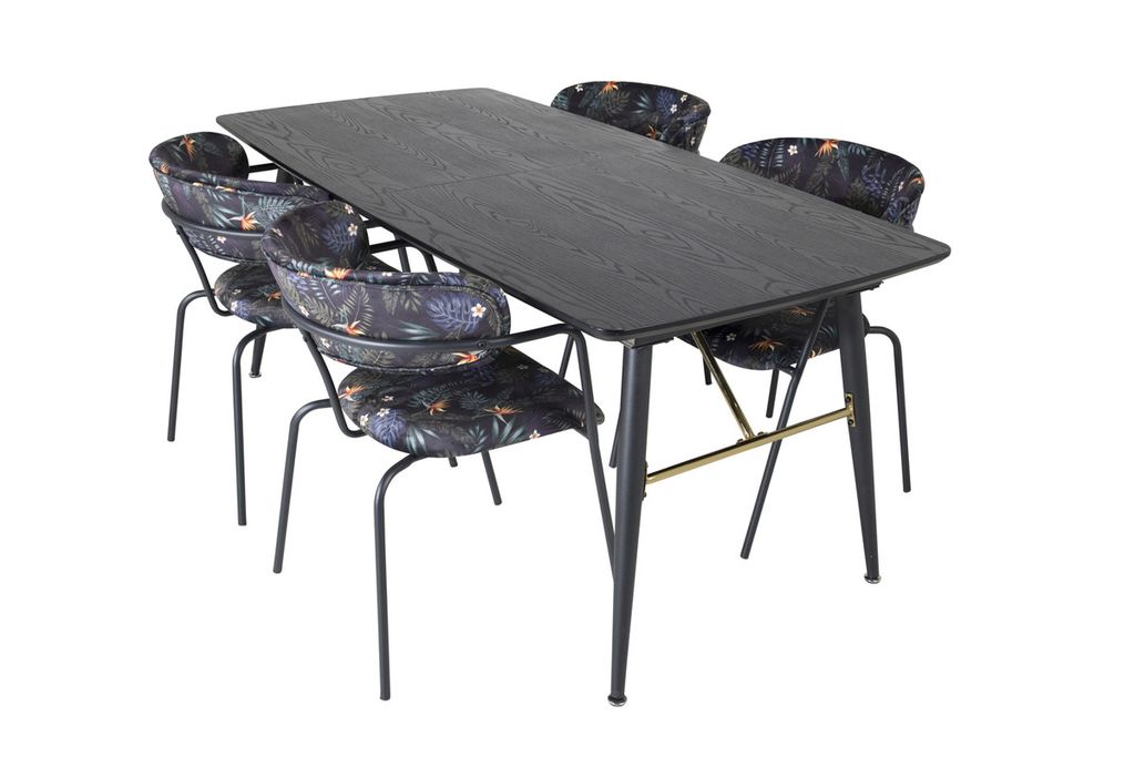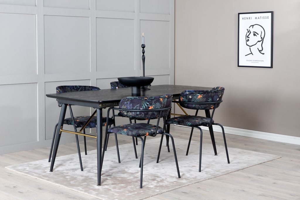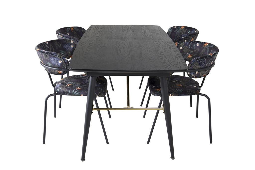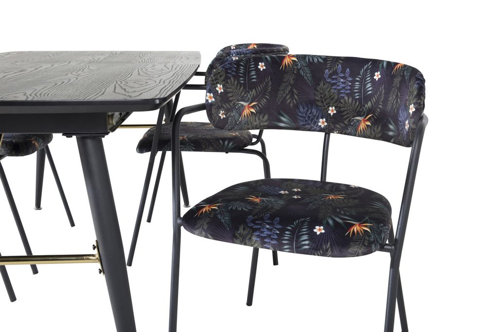 Trendigt och hemtrevlig! Matbord Gold har lyxiga gulddetaljer nedtill och är förlängingsbar, och tillsammans med Arrows svarta matstolar i blommönster är matgruppen som gjort för dig som vill skapa en ombonad och modern känsla i hemmet.