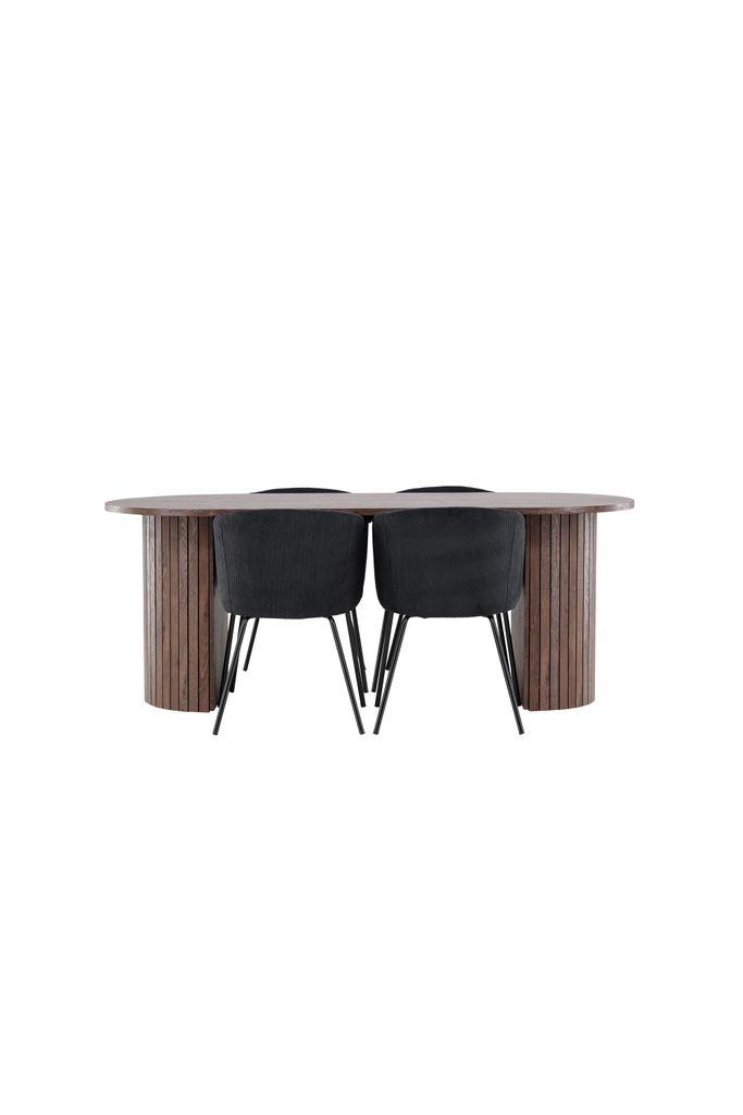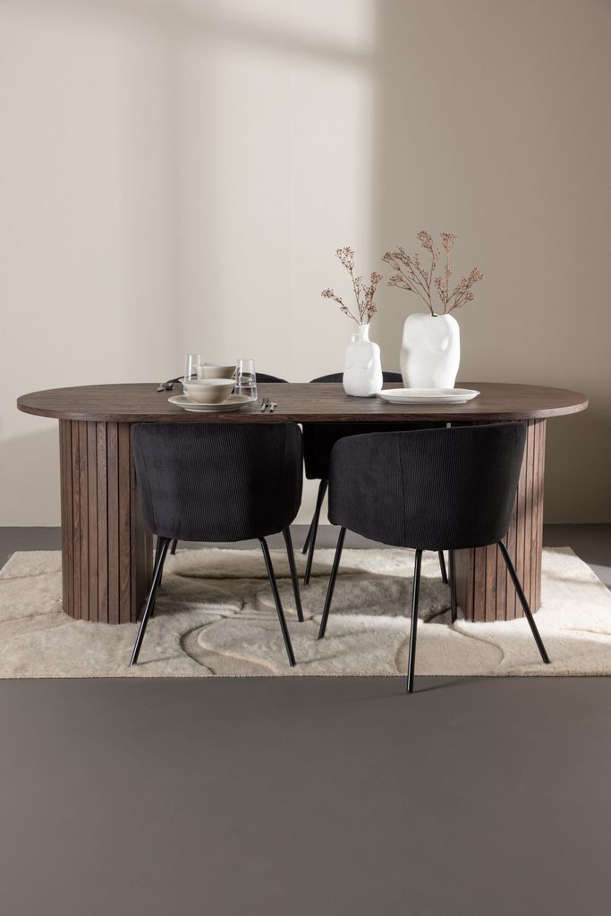 Stilfull matgrupp med svart velvet och moccafärgat bord, perfekt för både vardag och fest.