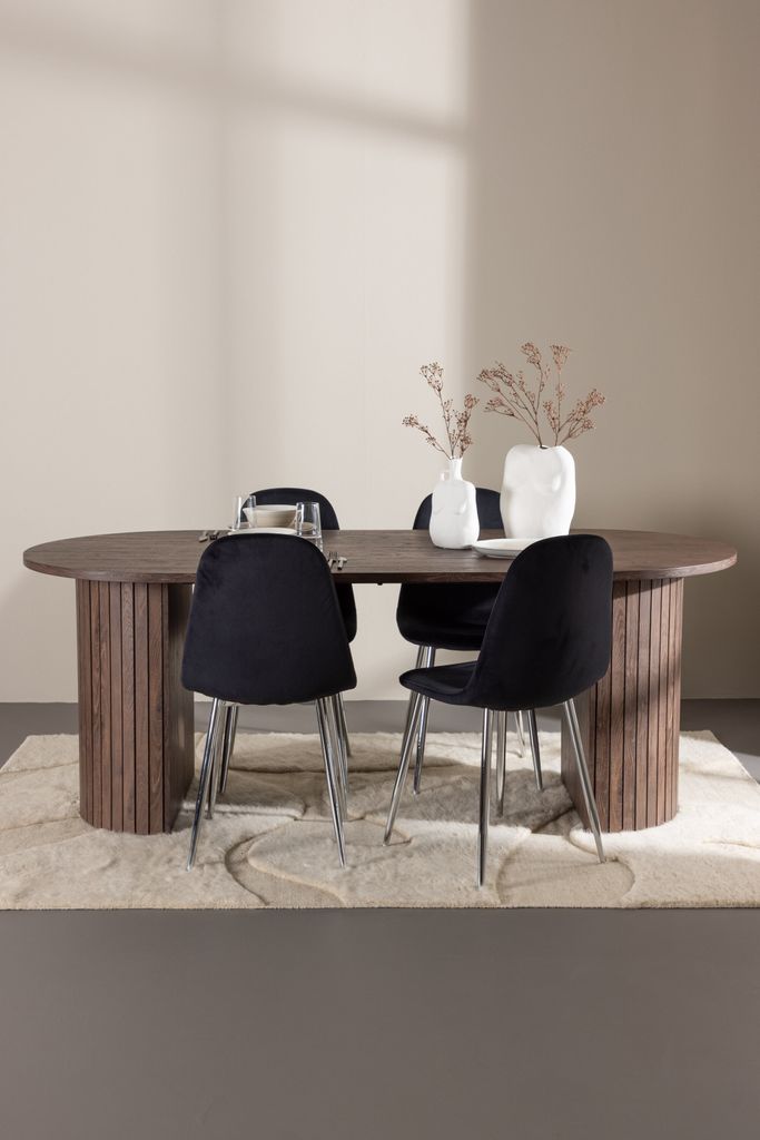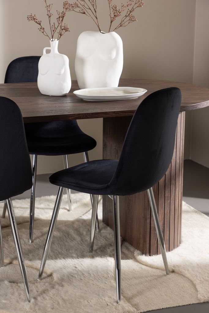 Evert matstolar har en helklädd design i svart sammetstyg, vilket ger en lyxig känsla. Den runda ryggen och den mjukt stoppade sitsen säkerställer komfort under långa måltider. De kromade metallbenen ger en modern touch som harmonierar perfekt med bordet.