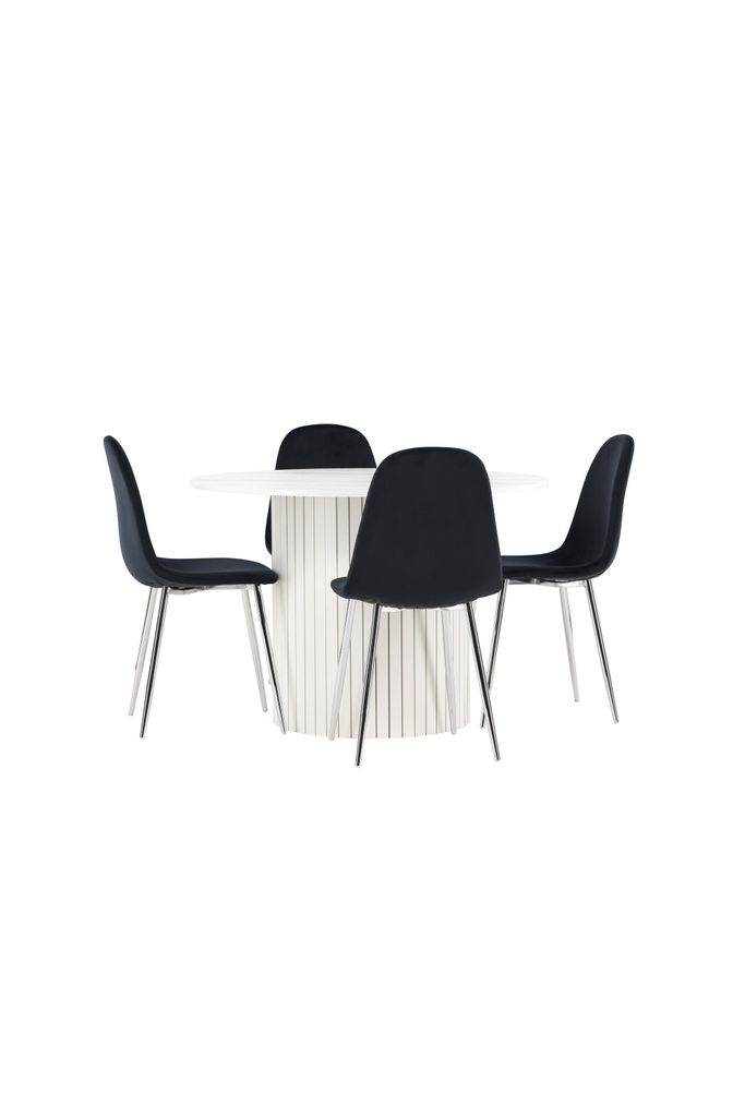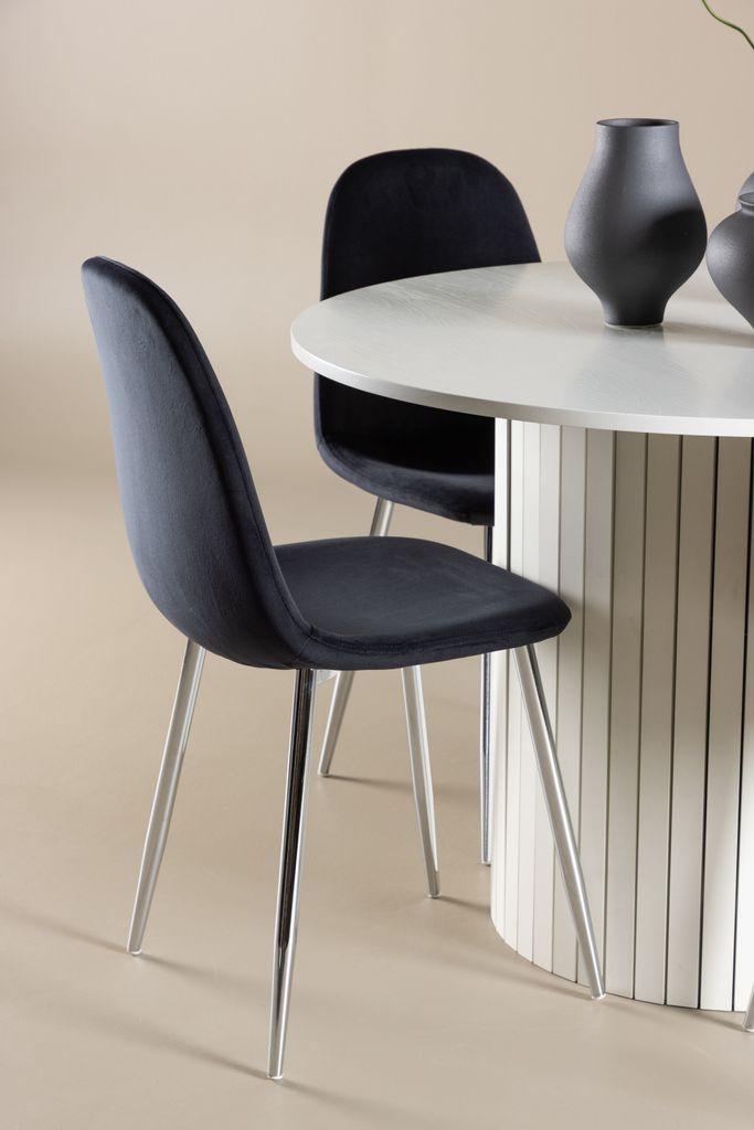 De fyra Polar-stolarna kompletterar bordet perfekt med sina eleganta sitsar klädda i svart sammet. Dessa stolar erbjuder både komfort och stil, vilket gör dem idealiska för långa, njutbara middagar med familj och vänner. Stolarnas moderna design med hög ryggstöd och mjuka sitsar ger ditt matrum en sofistikerad och samtida touch.