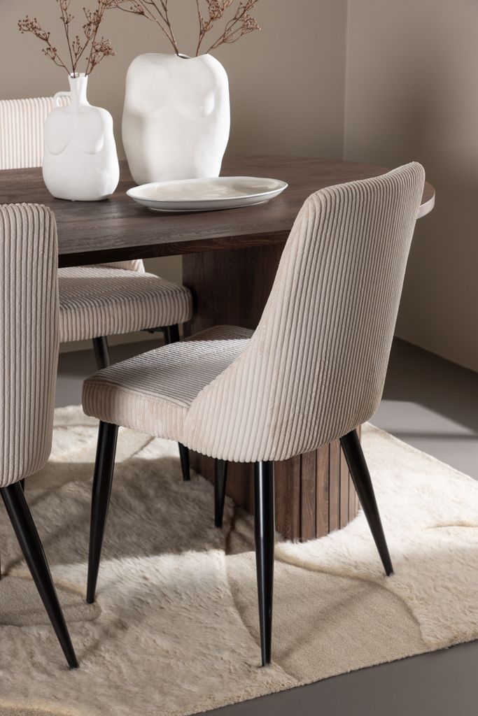Leone Matstol är FSC®-certifierad, vilket säkerställer att den är tillverkad av trä från ansvarsfulla källor. Stolen är klädd i mjuk manchester i en elegant beige ton, vilket ger en varm och inbjudande atmosfär. De robusta stålbenen säkerställer hållbarhet och stil, vilket gör denna stol mångsidig och perfekt för olika inredningsstilar.