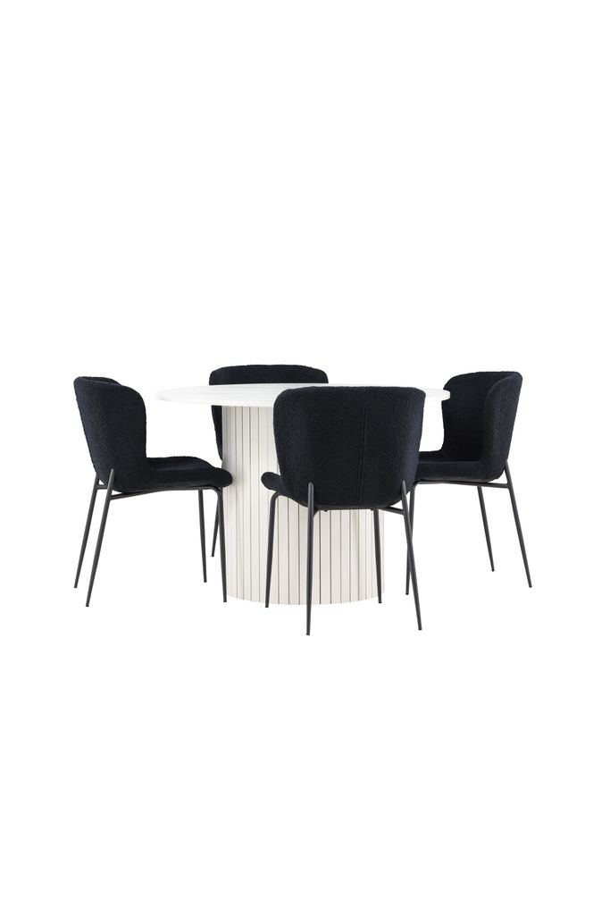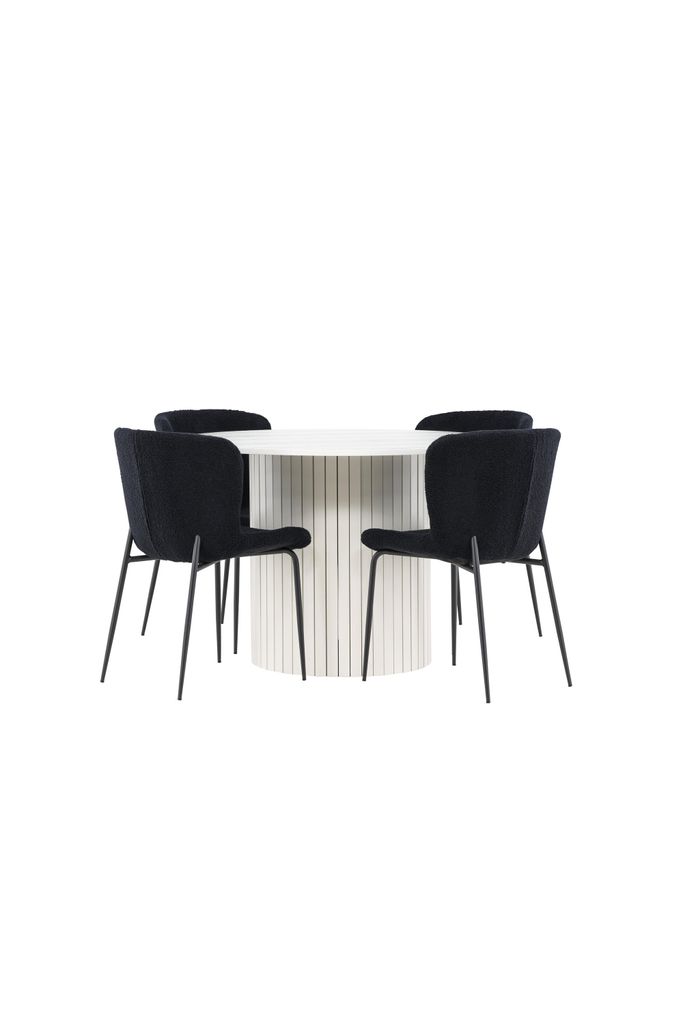 Modern matgrupp med stilrent vit bord och bekväma svarta teddyklädda stolar. Perfekt för alla tillfällen.