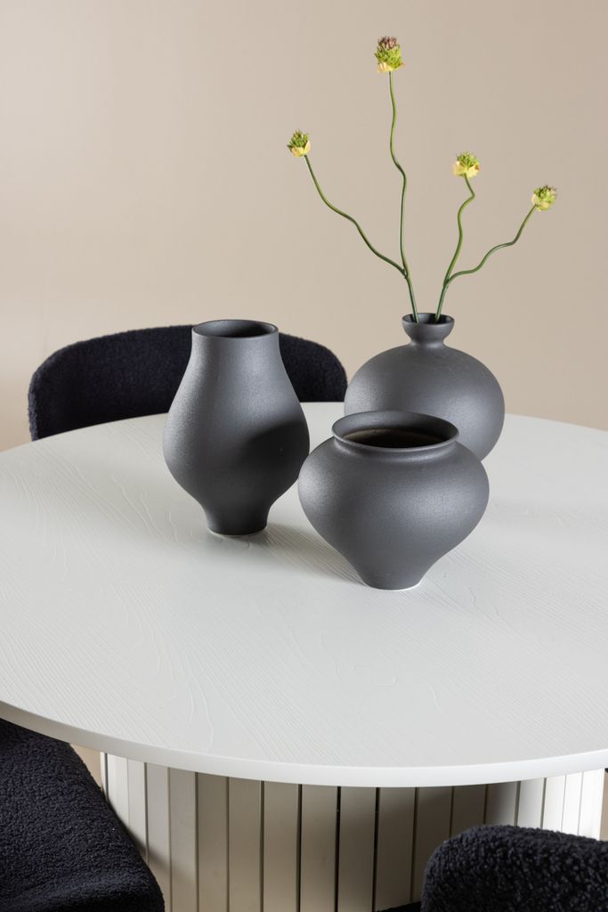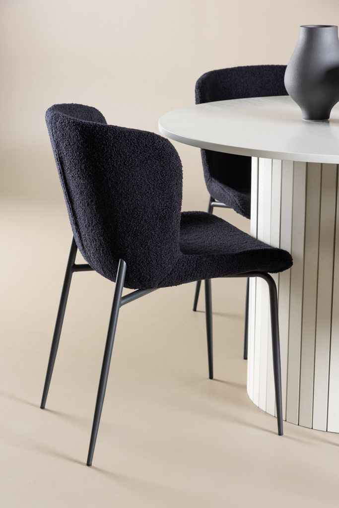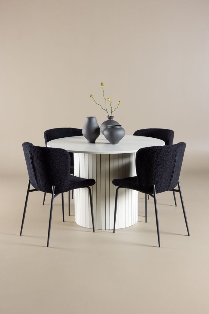 - Modesto-stolar: De fyra stolarna har eleganta sitsar klädda i svart polyester teddy. Dessa stolar erbjuder både komfort och stil, vilket gör dem idealiska för långa, njutbara middagar med familj och vänner. Deras moderna design med hög ryggstöd och mjuka sitsar ger ditt matrum en sofistikerad och samtida touch.