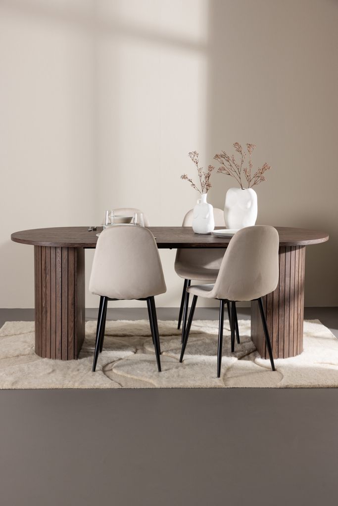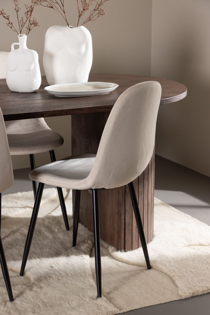 De stilrena Polar matstolarna i beige sammet ger en modern och inbjudande känsla. Med en lätt rundad rygg och sits, samt robusta ben i svart pulverlackerad metall, är dessa stolar både bekväma och visuellt tilltalande. För att bevara utseendet rekommenderas att impregnera textilen med textilspray och snabbt hantera fläckar med en trasa.