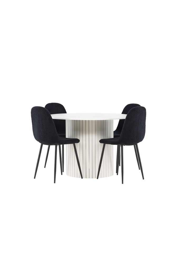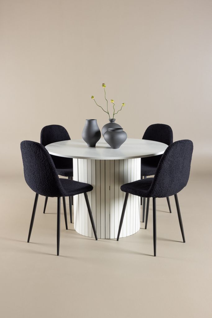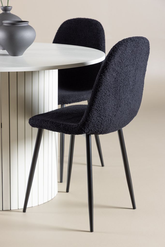 De fyra Polar-stolarna kompletterar bordet perfekt med sina eleganta sitsar klädda i svart polyester teddy. Dessa stolar erbjuder både komfort och stil, vilket gör dem idealiska för långa, njutbara middagar med familj och vänner. Deras moderna design med högt ryggstöd och mjuka sitsar ger ditt matrum en sofistikerad och samtida touch. De smala, svarta metallbenen ger stolarna en elegant och lätt känsla.