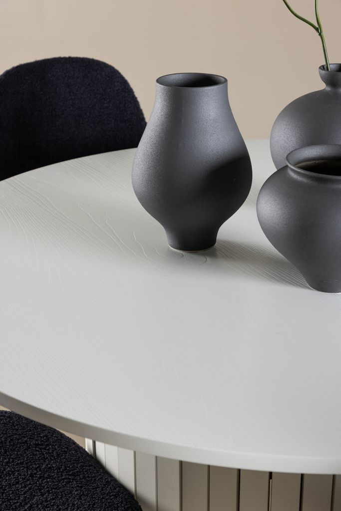 Matbordet Härön, tillverkat av vit MDF, har en tidlös design som tillför en fräsch och ljus känsla till ditt matrum. Med en diameter på 110 cm erbjuder bordet gott om plats för mat och samtal, samtidigt som dess runda form skapar en harmonisk och inbjudande miljö. Bordets robusta konstruktion säkerställer långvarig användning och stabilitet. Den vitlackerade ytan har en subtil trästruktur som ger en naturlig touch.