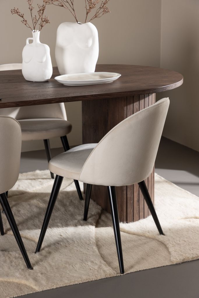 De stilrena Velvet matstolarna kommer i en elegant beige färg och har en helklädd design med en lätt rundad rygg och sits i lyxigt sammetstyg. Benen är i svart pulverlackerad metall, vilket ger en modern kontrast och stabilitet. Stolarna är lika bekväma som iögonfallande, vilket gör dem perfekta för långa middagar och samtal. Lättare montering krävs.