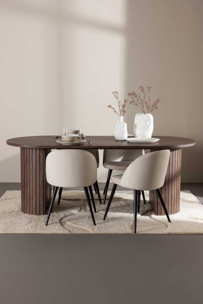 Elegant matgrupp med Velvet stolar i beige sammet och Härön bord i moccafärg, perfekt för stilfulla middagar.