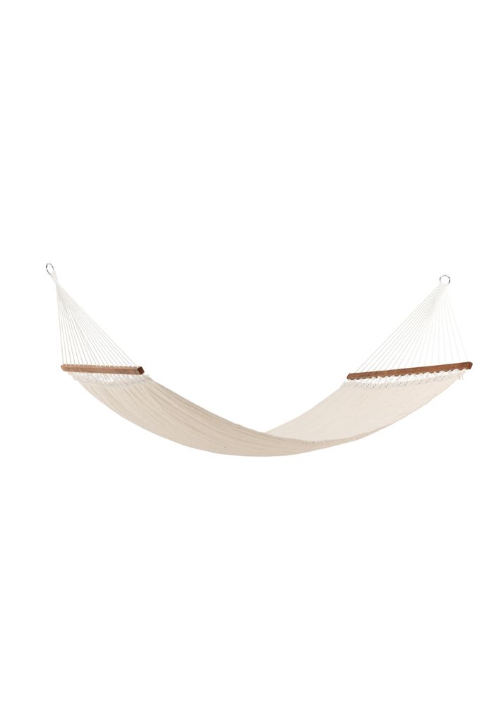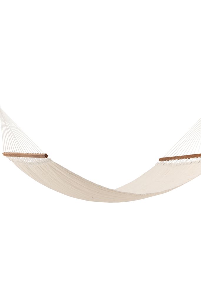 Modern och slitstark dubbel-hängmatta i krämvit polyester med dekorativ akaciaram för bästa komfort.