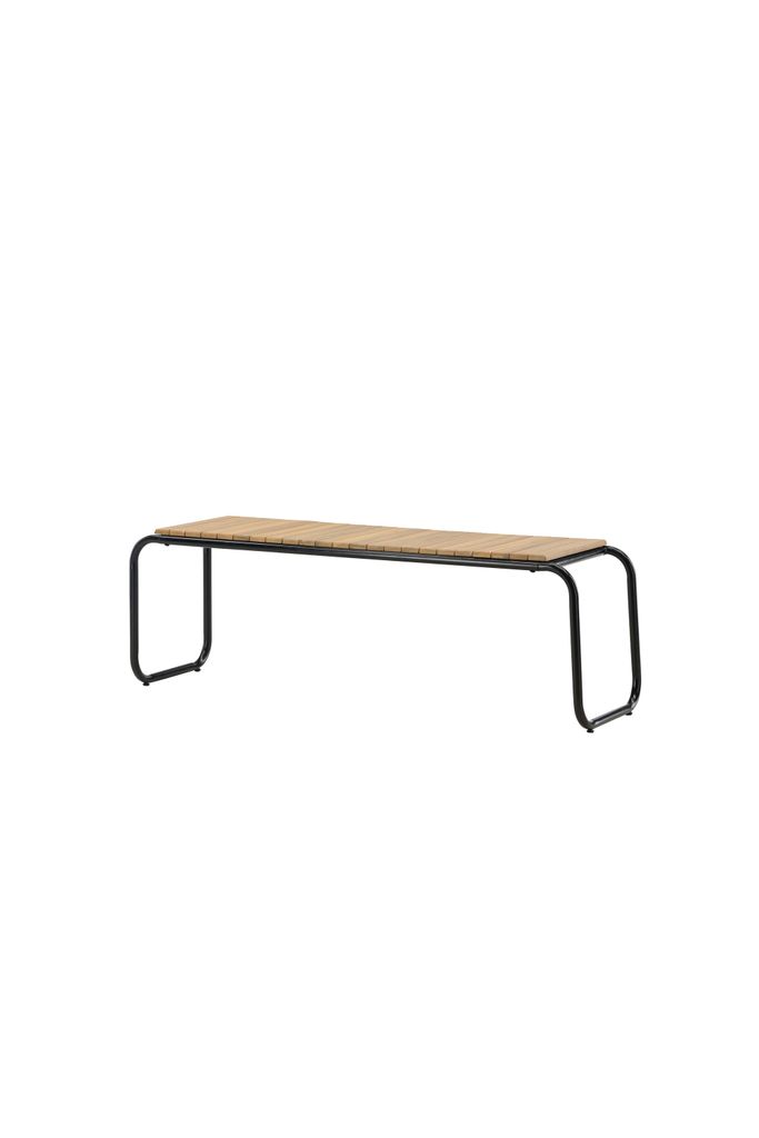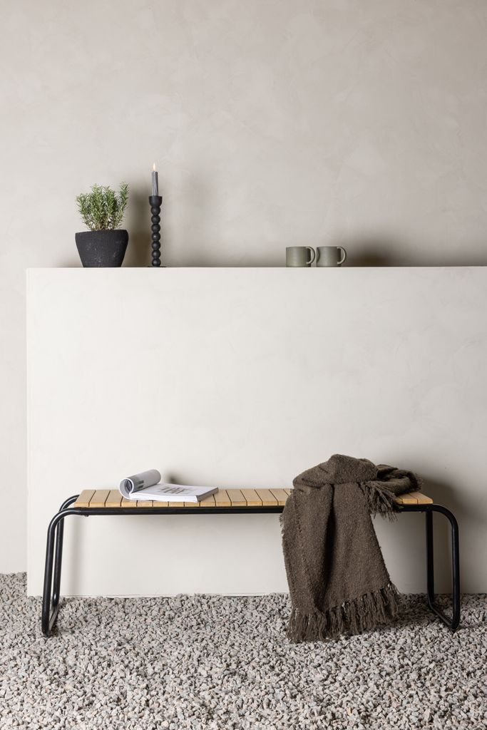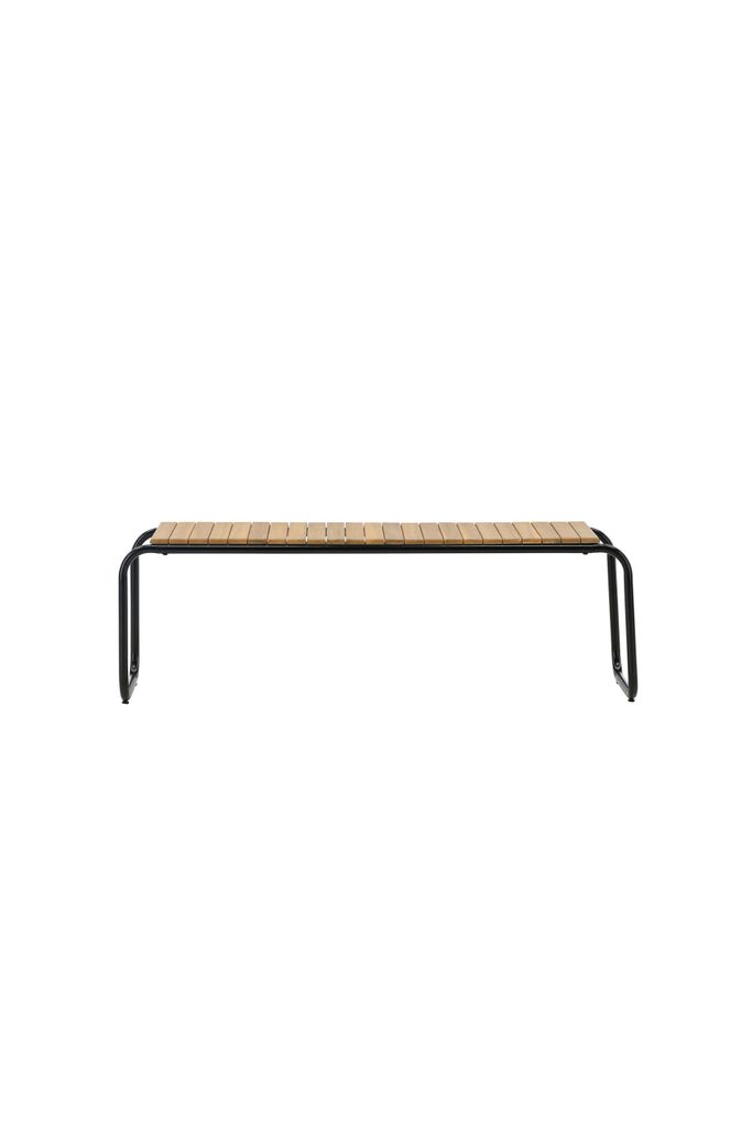 Stilren och slitstark bänk i acacia och svart stål. Perfekt för uteplatsen med sin luftiga och minimalistiska design.