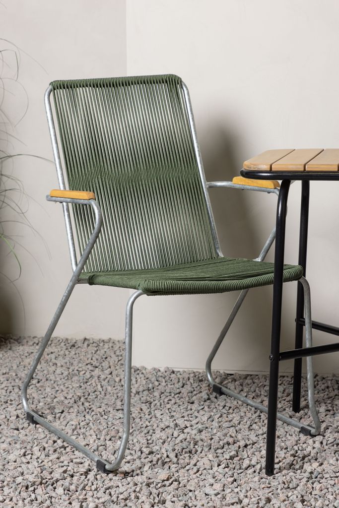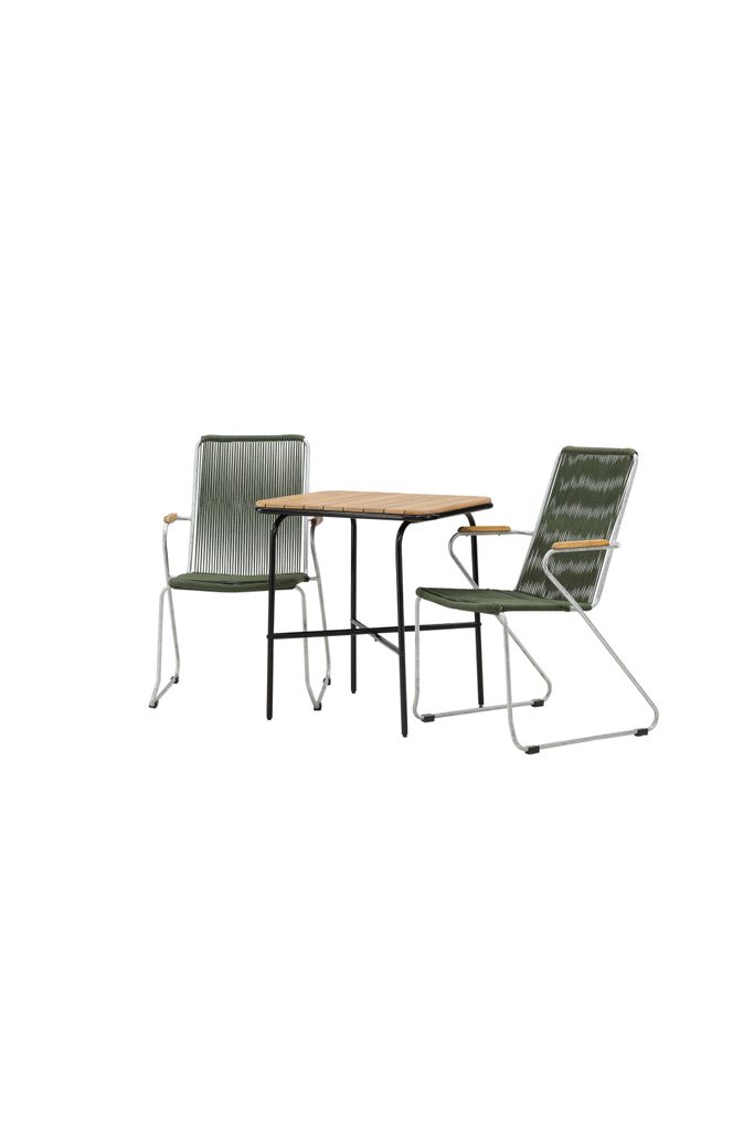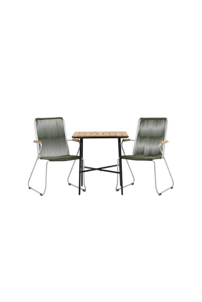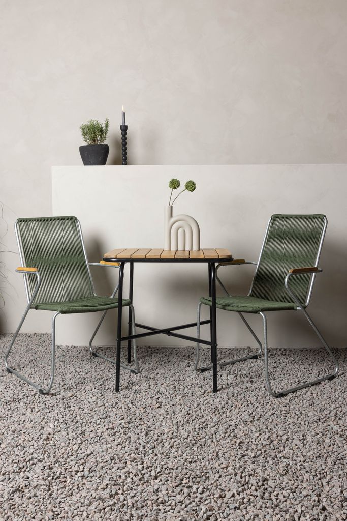 Matgruppen inkluderar två stolar från serien Bois, vilka har en robust zinkkonstruktion och en sits av slitstarkt, grönt rep. Stolarnas armstöd i teak ger en dekorativ och praktisk dimension som bidrar till bekvämligheten.