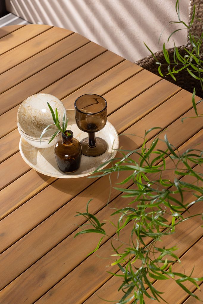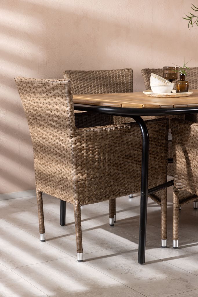 Elegant matgrupp med akaciabord och konstrottingstolar, perfekt för stil och komfort utomhus.