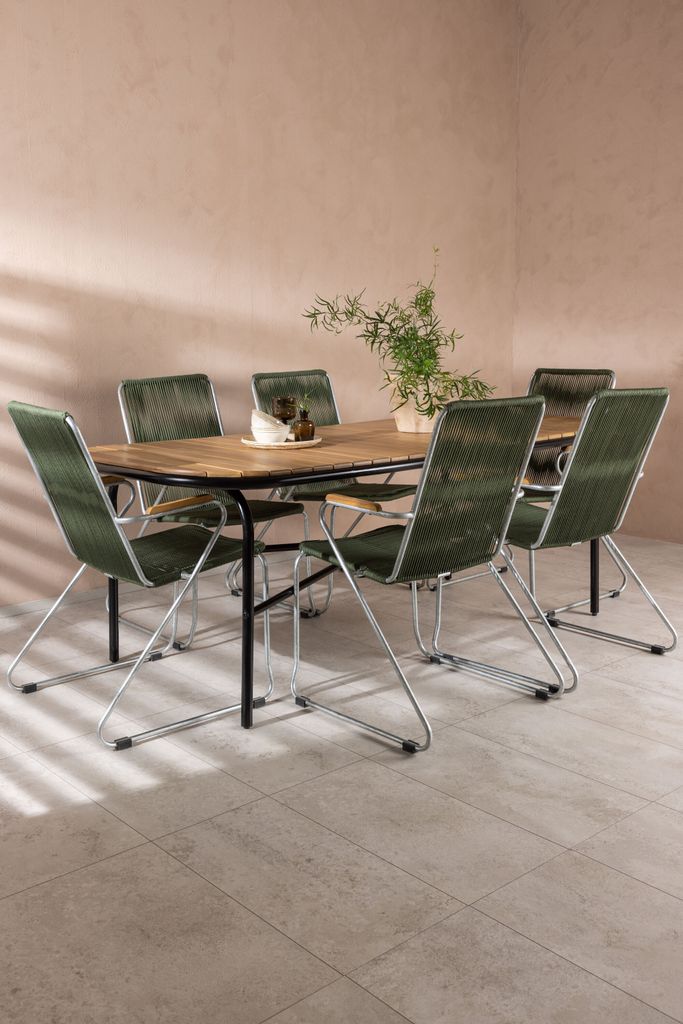 De medföljande stolarna från Bois-serien har en robust zinkkonstruktion och är klädda med smäckert grönt rep. De dekorativa armstöden i teak ger en extra touch av elegans och komfort. Den jordnära färgpaletten smälter perfekt in i naturens omgivning och skapar en inbjudande atmosfär på din altan eller i ditt uterum.