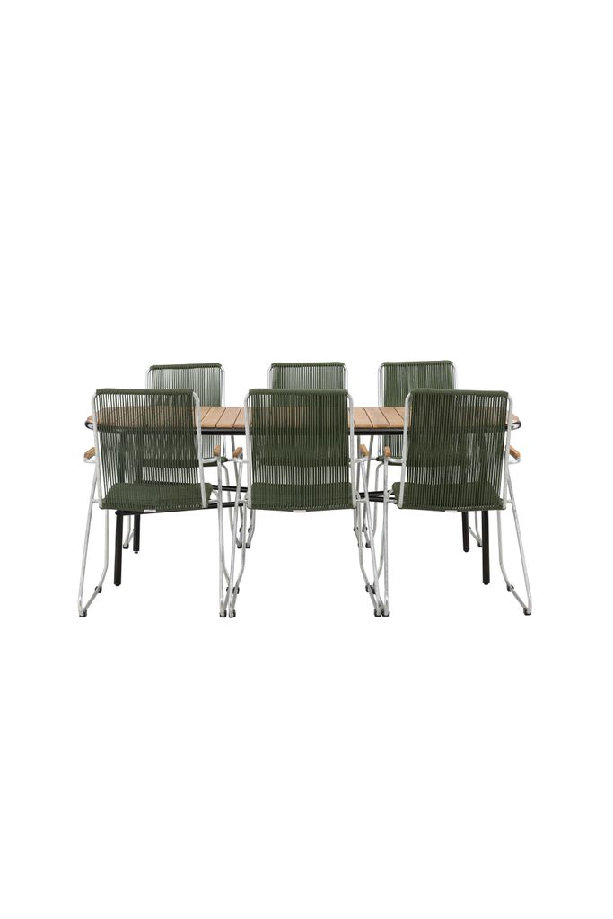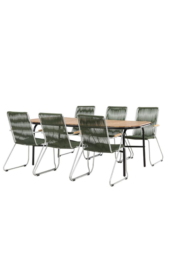 Elegant och hållbar matgrupp i akacia och stål med gröna stolar. Perfekt för altan eller uterum.
