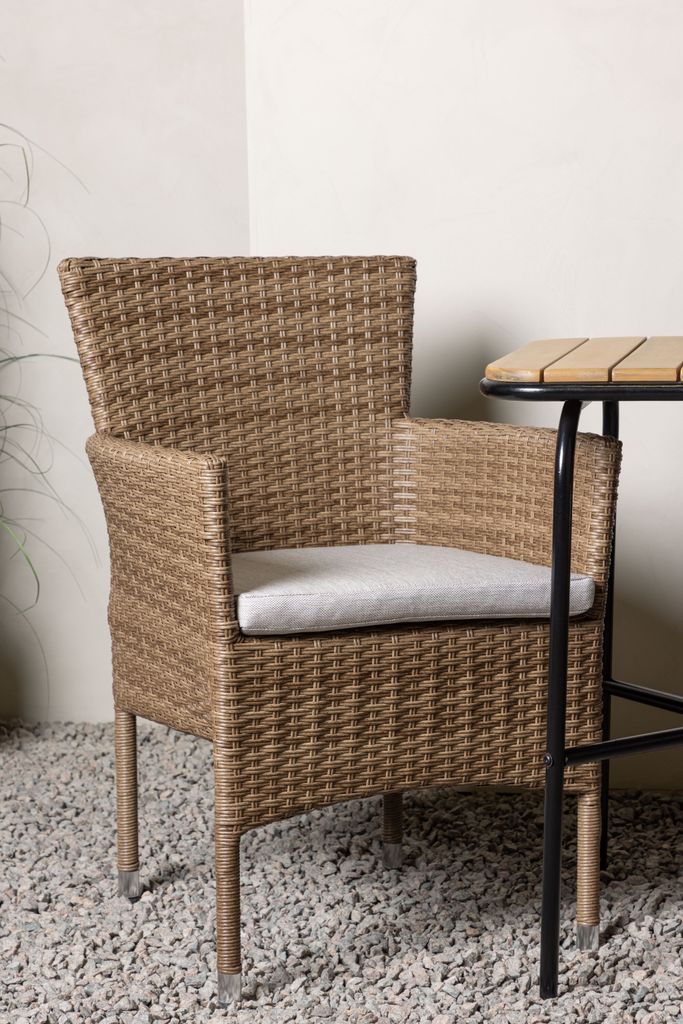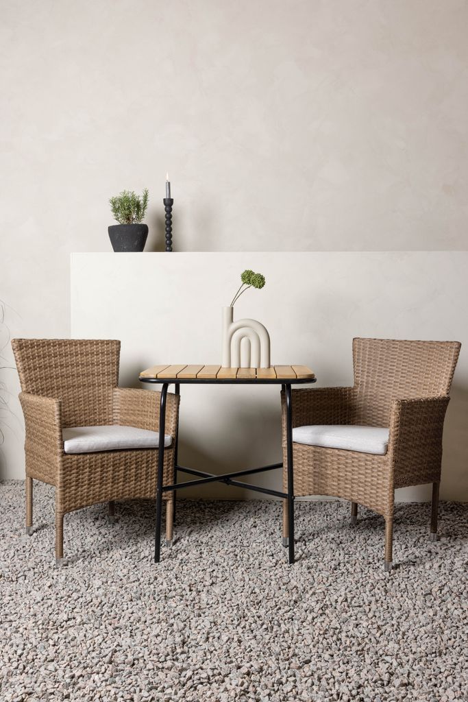 En elegant matgrupp med akaciabord och konstrottingstolar för sköna stunder utomhus. Perfekt för eftermiddagsfika.