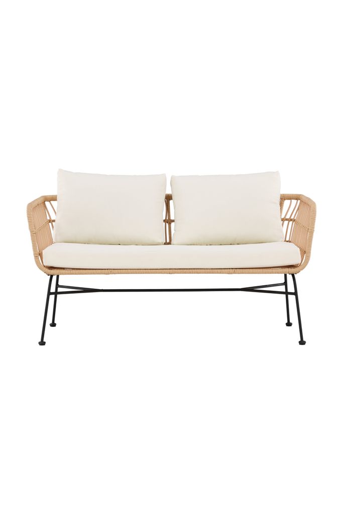 Elegant tresitssoffa i modern design med stålram och rotting. Bekväma, vädertåliga dynor i beige polyester.