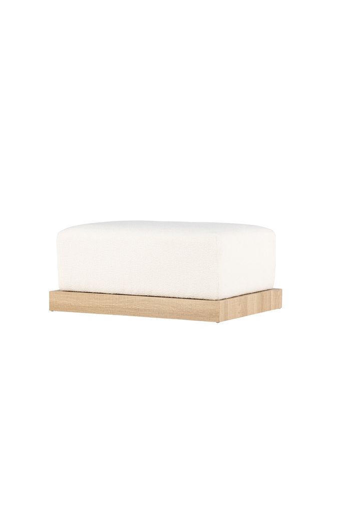 Modern sittpuff med vit bouclé och dekorativ träram. Perfekt som extra sittplats eller fotpall.