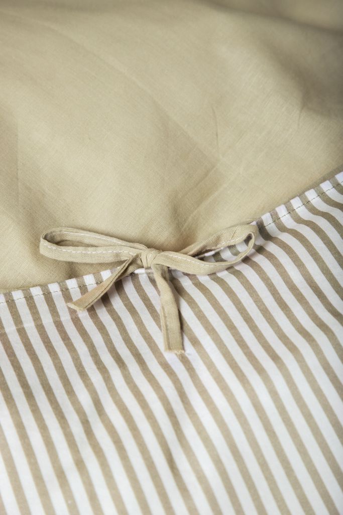 Detaljerna, såsom de diskreta knytbanden och de subtila randiga mönstren på insidan av örngotten, bidrar till en unik och stilfull design.