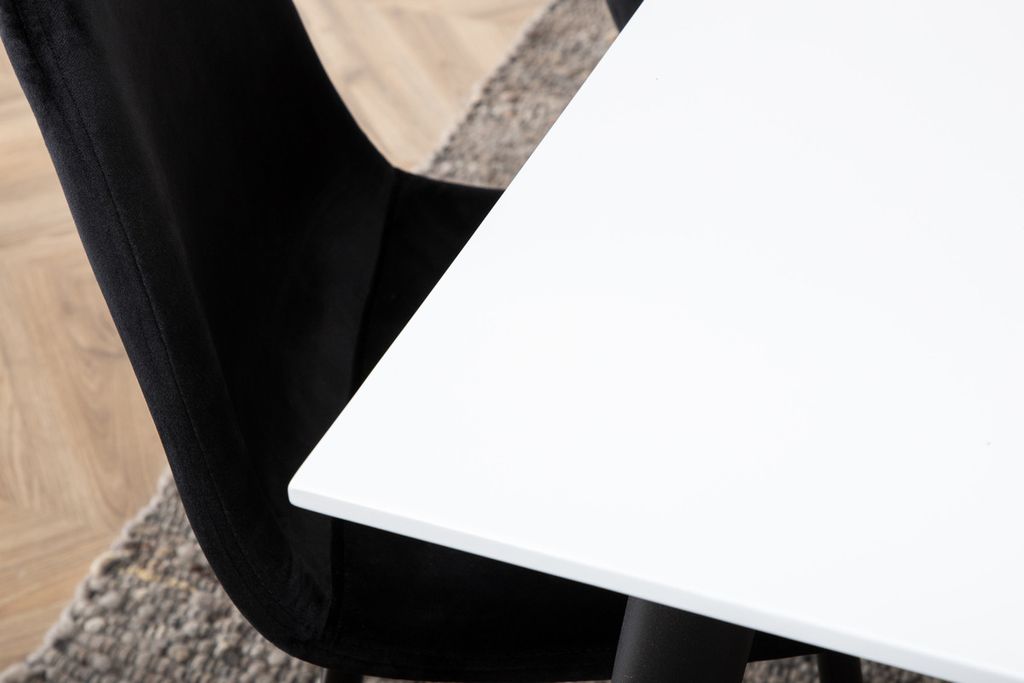 Med det klassiska och moderna matbordet Jimmy i skandinavisk design kan hela familjen samlas för middag och umgänge. Bordet är förlängningsbart och har en vit bordsskiva i HPL och MDF samt svarta, lätt utsvängda, bordsben i järn. Bordets mått: Längd förlängningsbart mellan: 195cm och 285cm, Bredd: 90cm, Höjd: 76cm. Här tillsammans med våra bekväma matstolar Polar i mjuk sammetssits och stolsben i svart metall. Stolens mått: Höjd: 88cm, Sitthöjd: 41,5cm, Bredd: 42,5cm, Djup: 53,3cm. Låt tiden vid matbordet bli till en av dagens höjdpunkter!