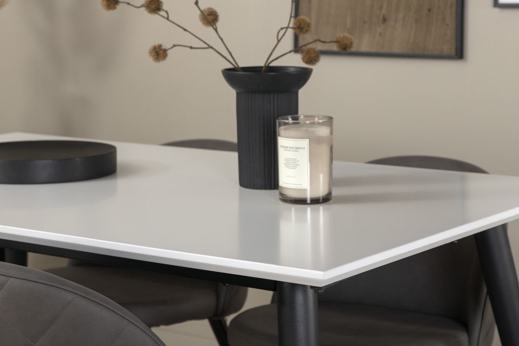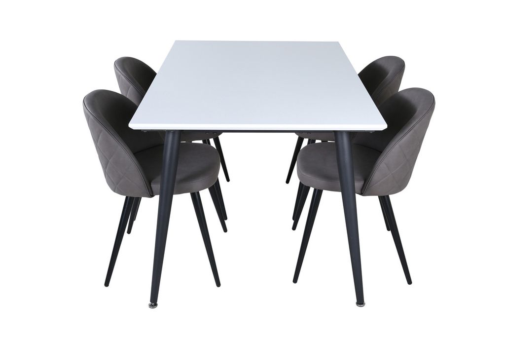 Skapa en hemtrevlig och inbjudande atmosfär i hemmets hjärta! Jimmy matbord är ett säkert kort för alla tillfällen. Med en förlängningsbar toppskiva i vit HPL och MDF faner och lätt utsvängda ben i svart metall passar det här bordet perfekt till alla inredningsstilar och hem. Bordets mått: Längd förlängningsbart mellan: 150cm och 240cm, Bredd: 90cm, Höjd: 76cm. Här i perfekt kombination med 4st av våra omtyckta Velvet Stitches matstolar. Stolsbenen i svart metall är utsvängda i skandinavisk design och sitsarna i grå mikrofiber har snygg dekorsöm på stolsryggen. Stolens mått: Höjd: 76,5cm, Sitthöjd: 46,5cm, Bredd: 50cm, Djup: 57cm.