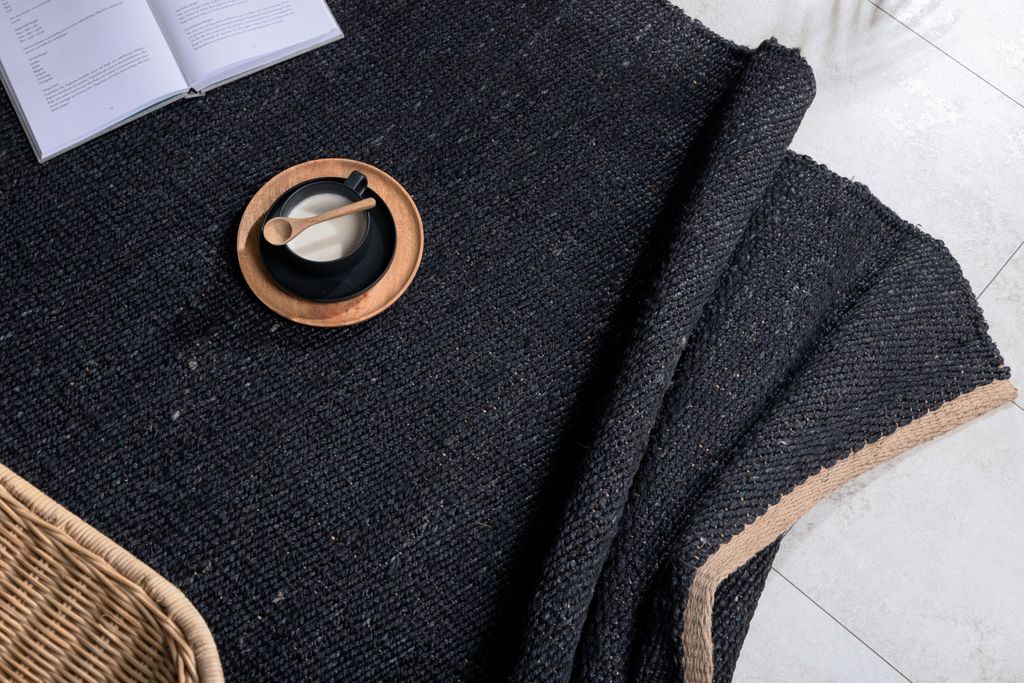 Elegant och slitstark svart jutematta med naturfärgad kant. Perfekt för både vardagsrum och hall.