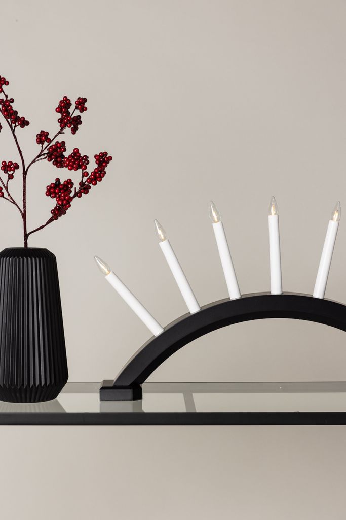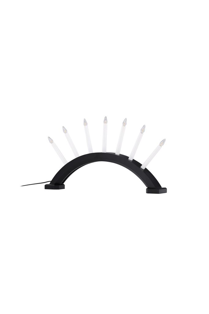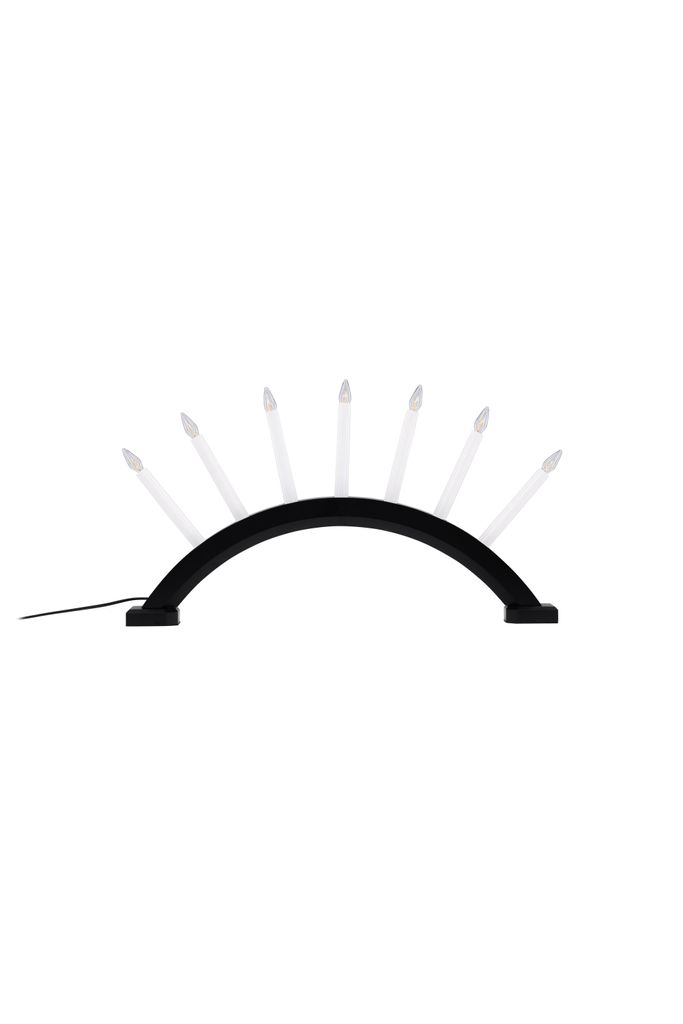 Venture Home Kebnekaise Adventsstjärna är en elegant bordslampa som lyfter ditt rum med sitt varma och inbjudande ljus. Denna lampa är formad som en traditionell adventsljusstake med en bågformad stomme som rymmer sju vita lampor. Den svarta pinje-träkonstruktionen ger en sofistikerad och tidlös känsla som passar in i alla inredningsstilar.