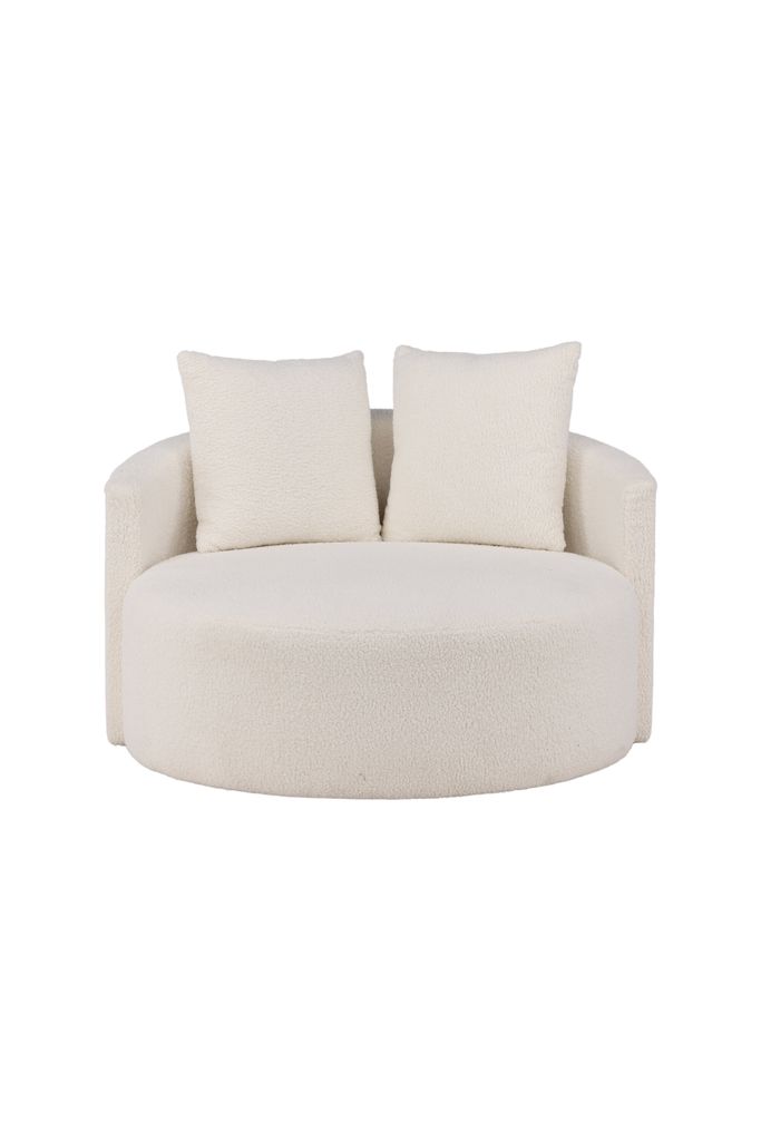 Romantisk två-sitssoffa i vitt teddytyg med rundad design och bekväma kuddar, perfekt för det moderna hemmet.