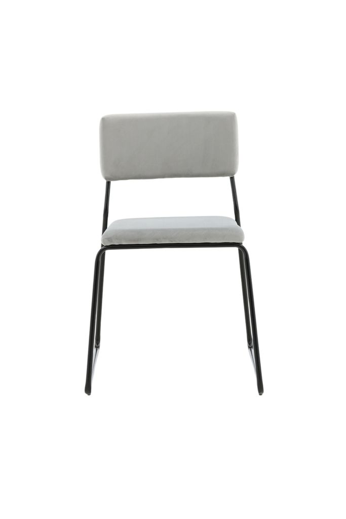 Stilrena matstolar i ljusgrå sammet och svart järn för en modern känsla i hemmet.
