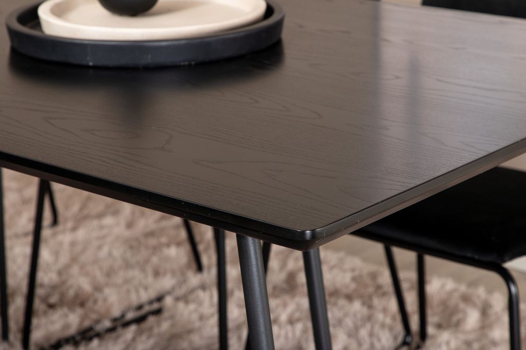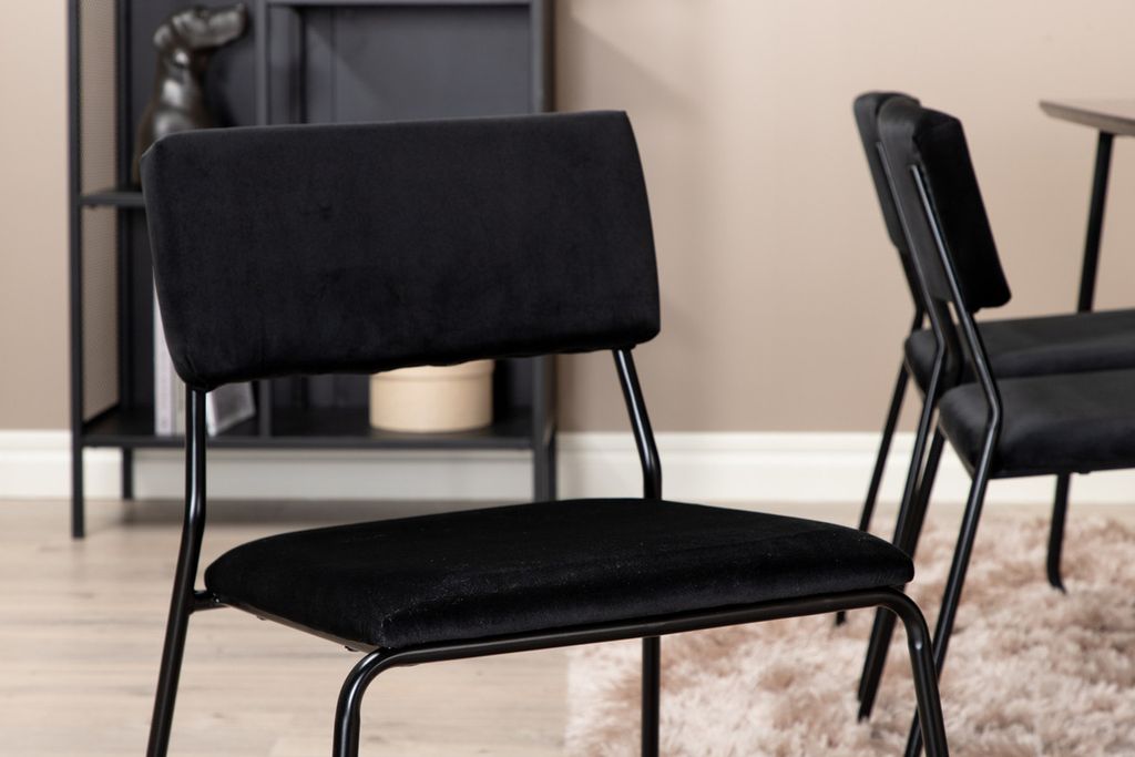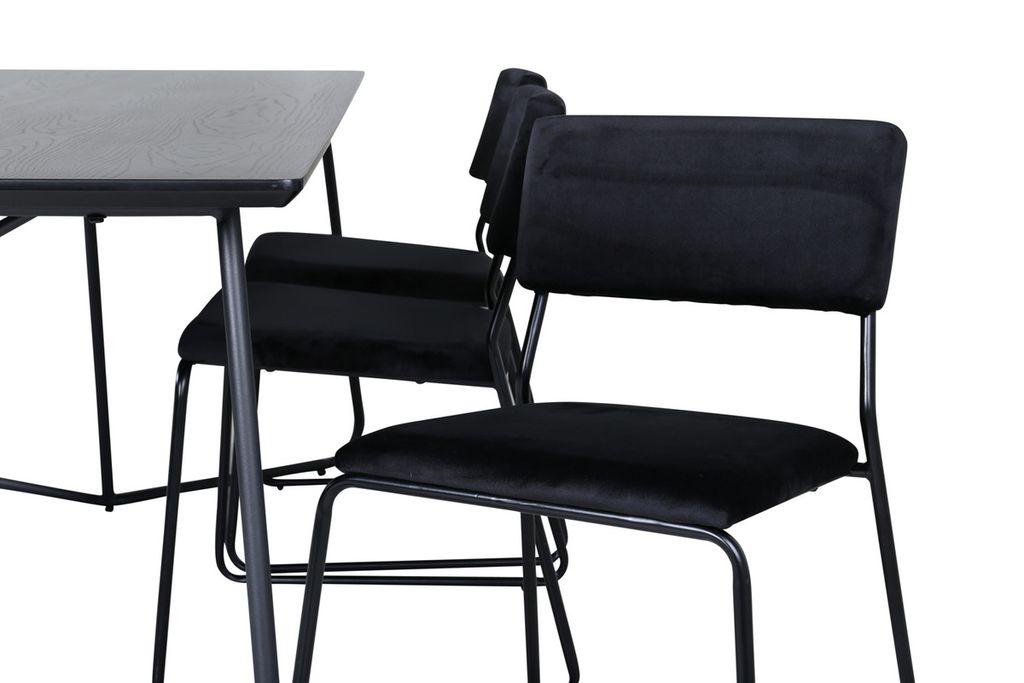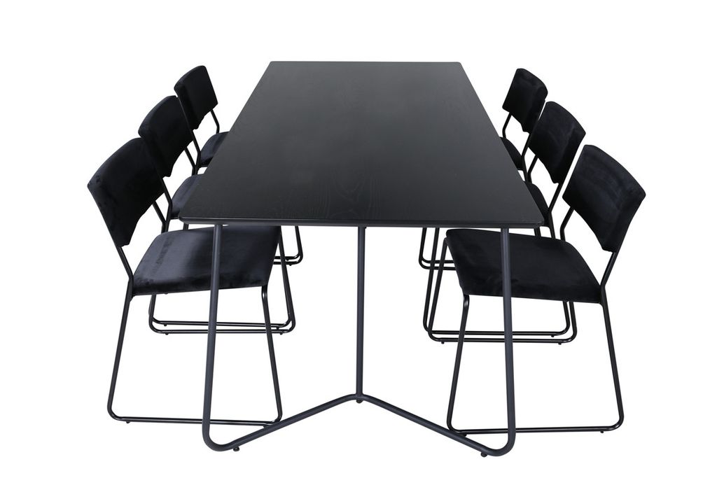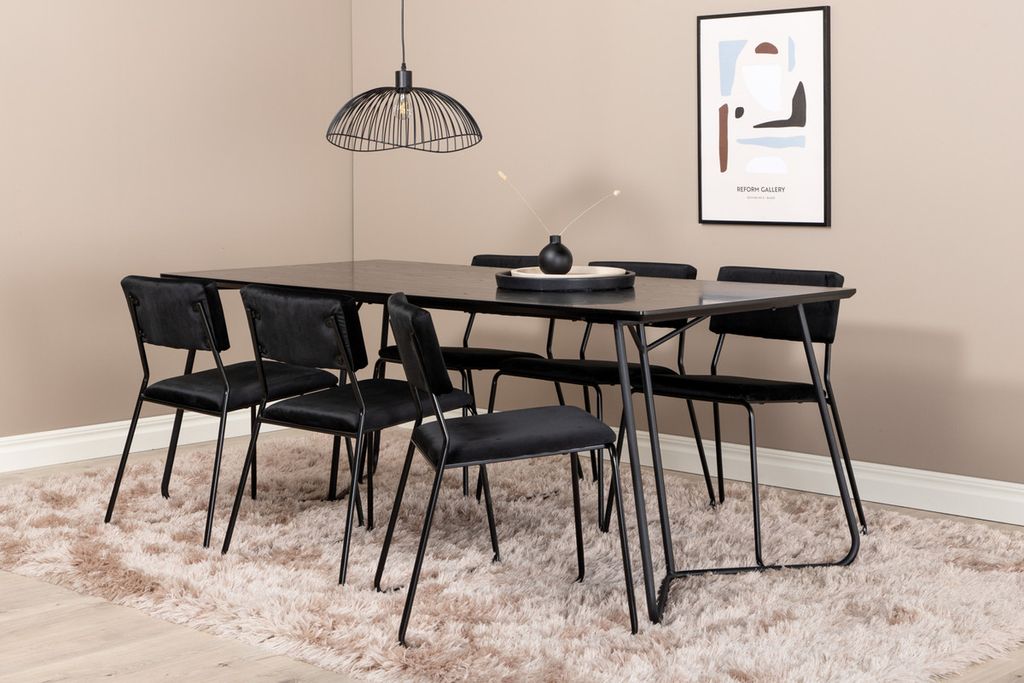 Inbjudande, stilsäkert och tidlöst – Matbord Petra skapar ett modemedvetet intryck i ditt hem! Designen är genomtänkt med skandinaviska former som ger en stilren känsla, smala, lätt utsvängda ben i järn och en bordsskiva i svart MDF med faner. Bordets mått: Längd: 190cm, Bredd: 90cm, Höjd: 75cm. Matchas här med 6st Kenth matstolar i svart kulör med stolsben i järn och sitsar av mjukt sammetstyg. Stolens mått: Höjd: 76cm, Sitthöjd: 48,5cm, Bredd: 40cm, Djup: 52cm. Låt hemmets hjärta prydas av den här iögonfallande matgruppen!