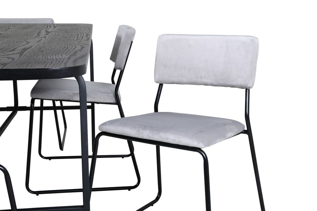 Stilren och luftig matgrupp för alla tillfällen - möblera vardagsrummet smart och inbjudande! Matbord Uno är rektangulärt utformat med lätt rundade hörn, en toppskiva i svart MDF med faner samt stilrent underrede i svart metall. Bordets mått: Längd: 200cm, Bredd: 90cm, Höjd: 74cm. Här i smäcker kombination med 6st Kenth matstolar i minimalistisk design. Stolsbenen är stilrent smala i svart järn och sitsarna i grått sammetstyg. Stolens mått: Höjd: 76cm, Sitthöjd: 48,5cm, Bredd: 40cm, Djup: 52cm. Njut av trivsamma måltider framöver!