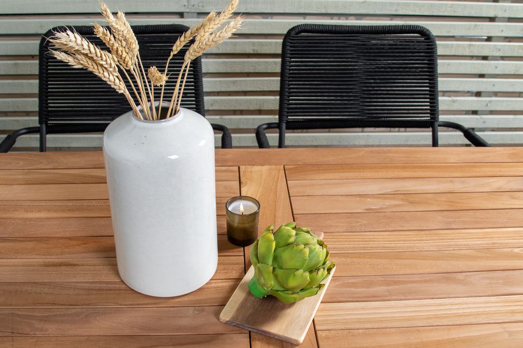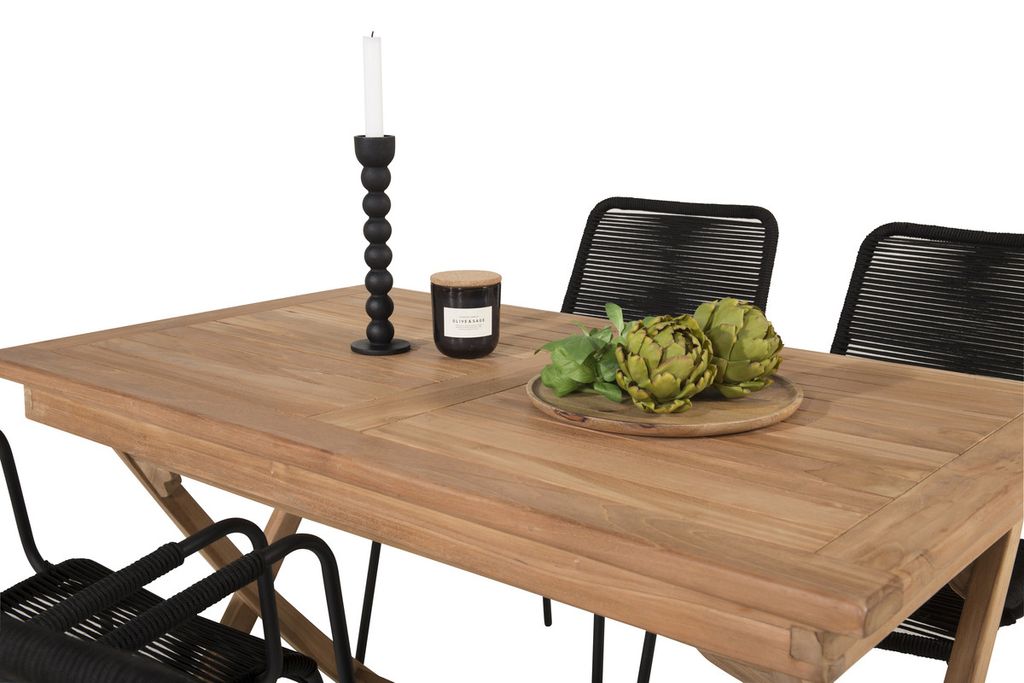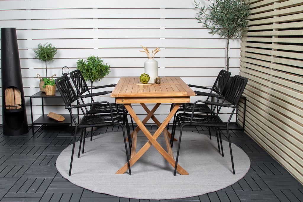 Stilren, trendsäker och bekväm matgrupp i skandinavisk design! Vårt omtyckta, rektangulära matbord Kenya har en tidlös design med ribbat utförande i smakfull teak. Kryssbenen ger ett stadigt och charmigt intryck. Mått: 120x70 cm. Här i smäcker kombination med läckra matstolar från serien Lindos. Stolarna har integrerade armstöd i svart stål och en sits i slitstarkt, svart rep. Möblera inbjudande på uteplatsen och skapa ett blickfång som imponerar!