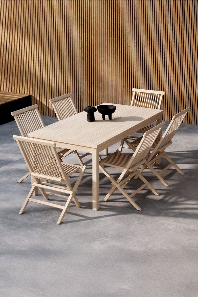 Elegant och hållbar matgrupp i teak med stilren whitewash-finish för utomhusbruk. Perfekt för trädgård och altan.