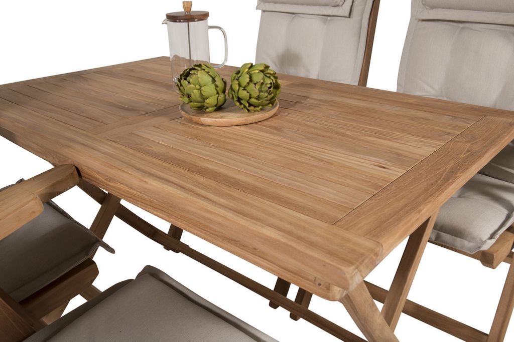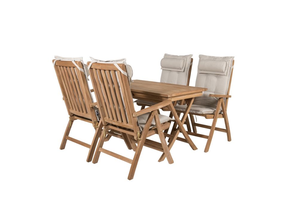 Möblera uteplatsen i jordnära kulörer med en matgrupp i skandinavisk design! Vårt omtyckta, rektangulära matbord Kenya har en tidlös design med ribbat utförande i smakfull teak. Kryssbenen ger ett stadigt och charmigt intryck. Mått: 120x70 cm. Här i smäcker kombination med 4st läckra matstolar från samma serie. Stolarna är fällbara för optimal avkoppling och har armstöd för extra komfort. Möblera uteplatsen inbjudande och skapa ett blickfång som imponerar!