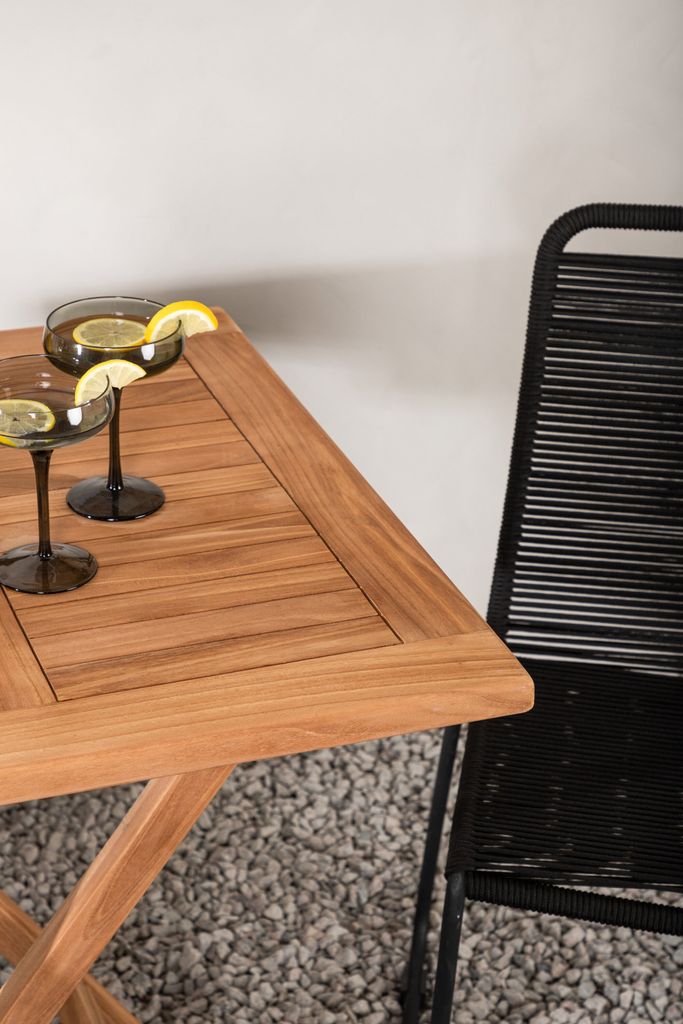 Charmig matgrupp i teak och svart aluminium, perfekt för uteplatser. Inkluderar ett rektangulärt cafébord och två stilrena stolar.