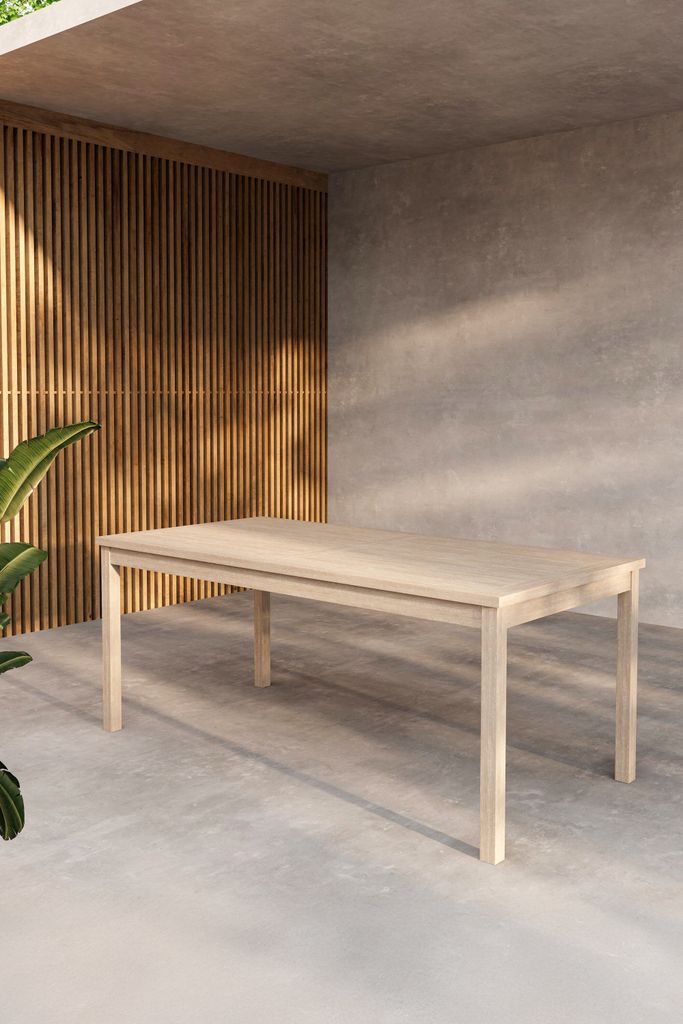 Imponerande teakbord med elegant whitewash-finish, perfekt för att samla familj och vänner till middagar.
