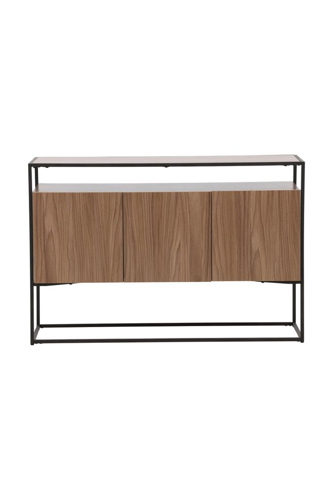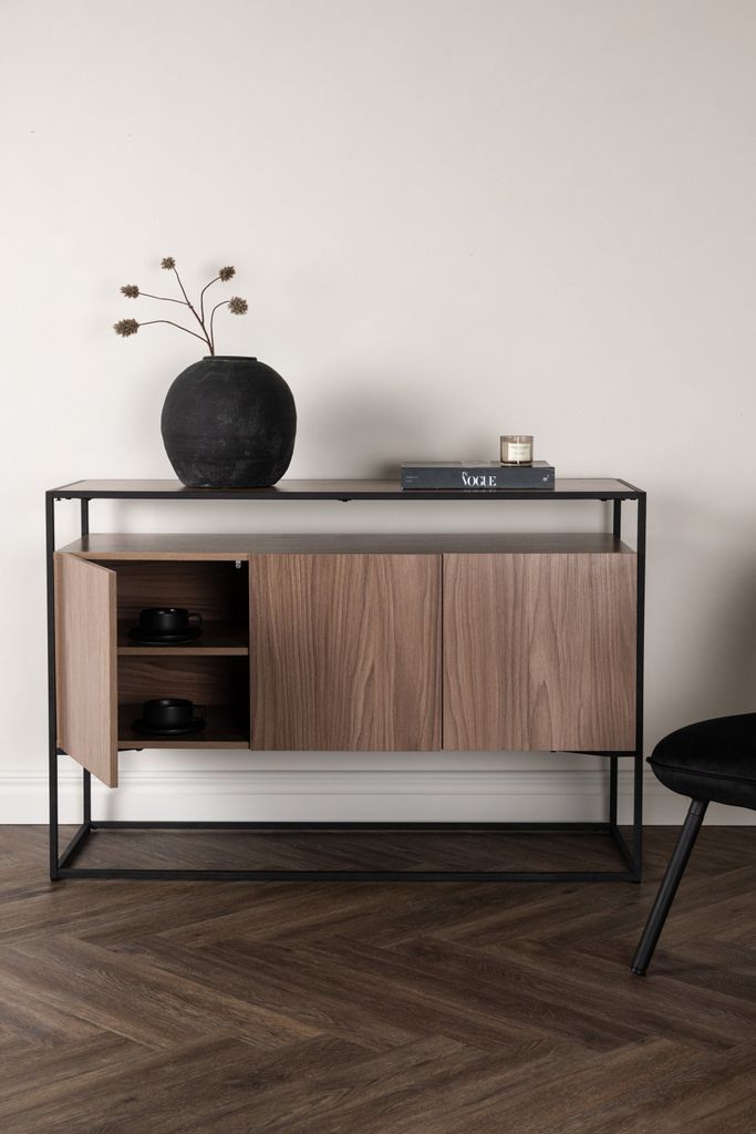 Stilrent avlastningsbord i valnötsfärgad MDF och svart stålram för praktisk och elegant förvaring.
