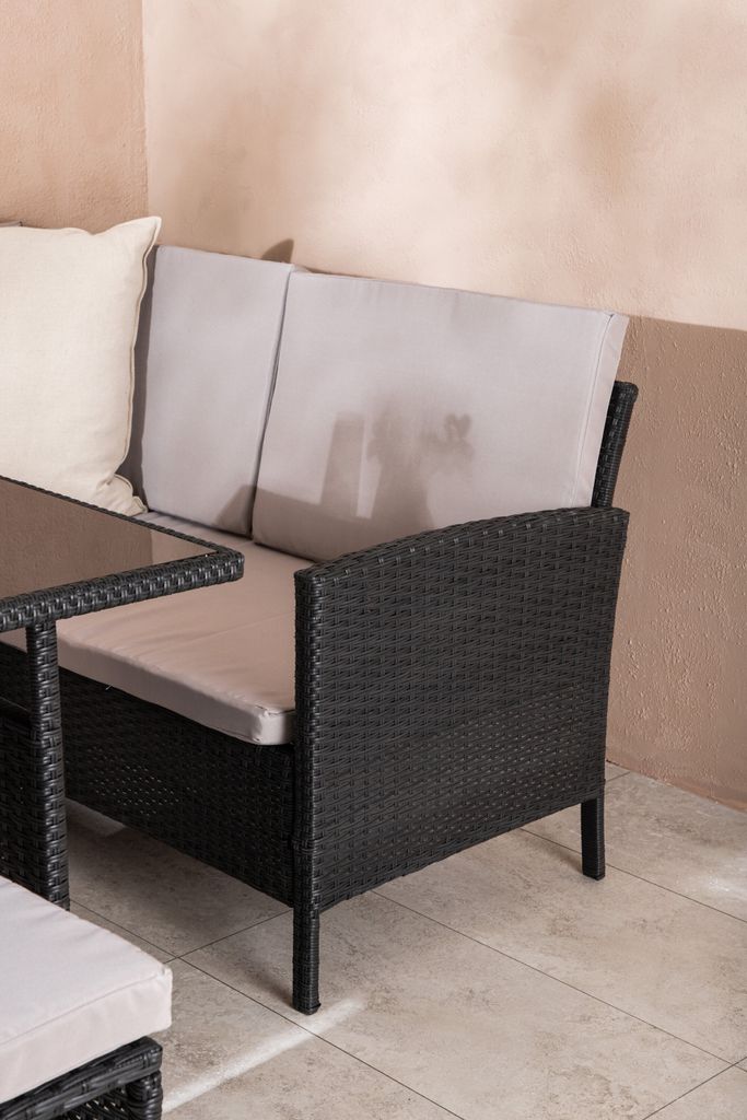 Den eleganta soffgruppen är tillverkad av svart konstrotting, vilket ger ett stilrent intryck och samtidigt är mycket hållbart. Gruppens struktur består av en hörnsoffa med fyra sittplatser och en hörndel, kompletterad med två sittpallar. Detta ger gott om utrymme för avkoppling och sociala stunder.