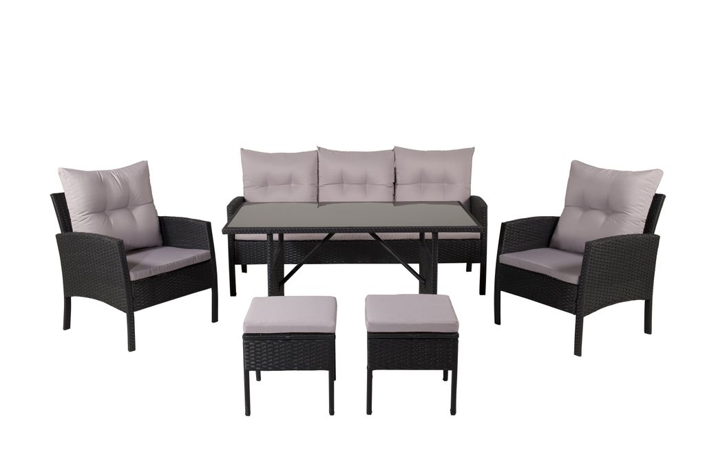Modern och mångsidig soffgrupp i svart konstrotting med grå dynor. Perfekt för altanen eller uterummet.