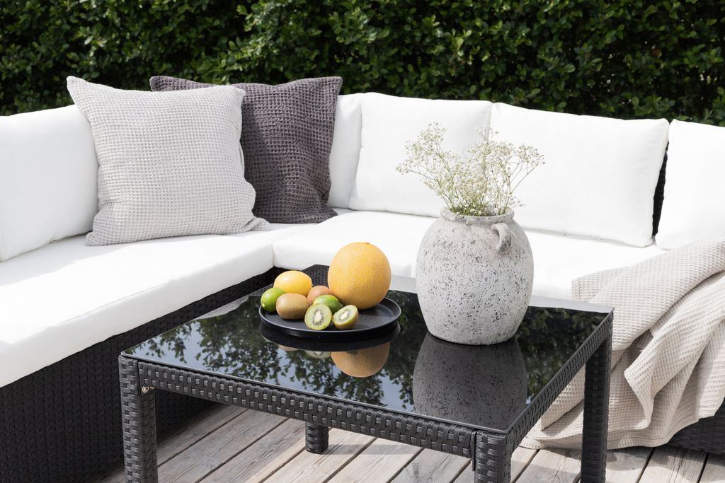 Modern hörnsoffgrupp i svart konstrotting med vita dynor och glasbord. Perfekt för uteplatsen.