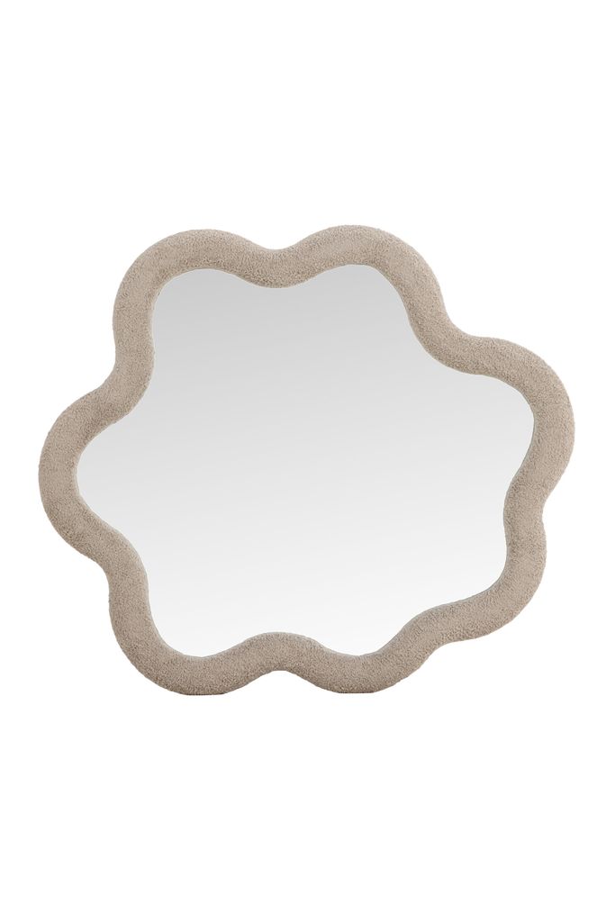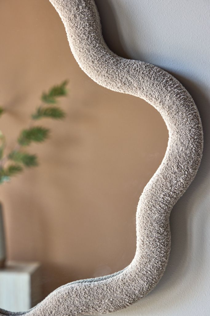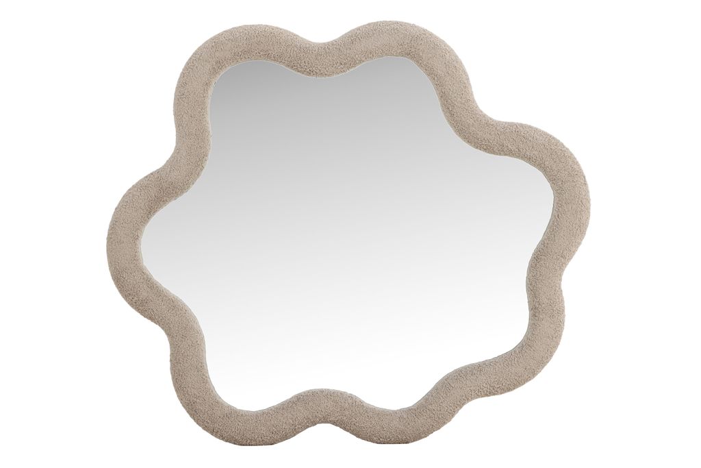 Kungsbacka-spegeln erbjuder en lekfull och harmonisk design med en beige boucléram, perfekt för alla rum.