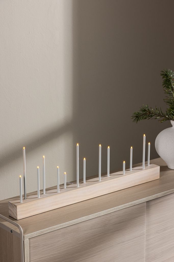Kungsberget adventsljusstake i vitvättad MDF skapar en varm julstämning med 14 lampor.