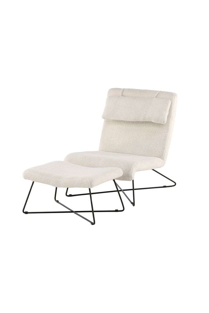Elegant loungestol med vit boucle och svart stålram. Inkluderar fotpall och nackkudde för maximal komfort.