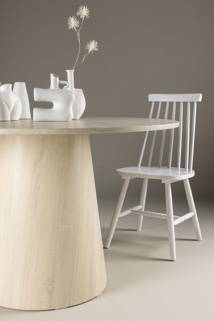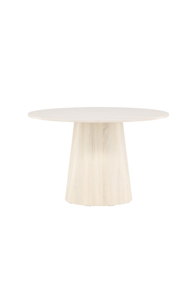 Lanzo matbord med 120 cm diameter i vitpigmenterad MDF, perfekt för stilfulla middagar.