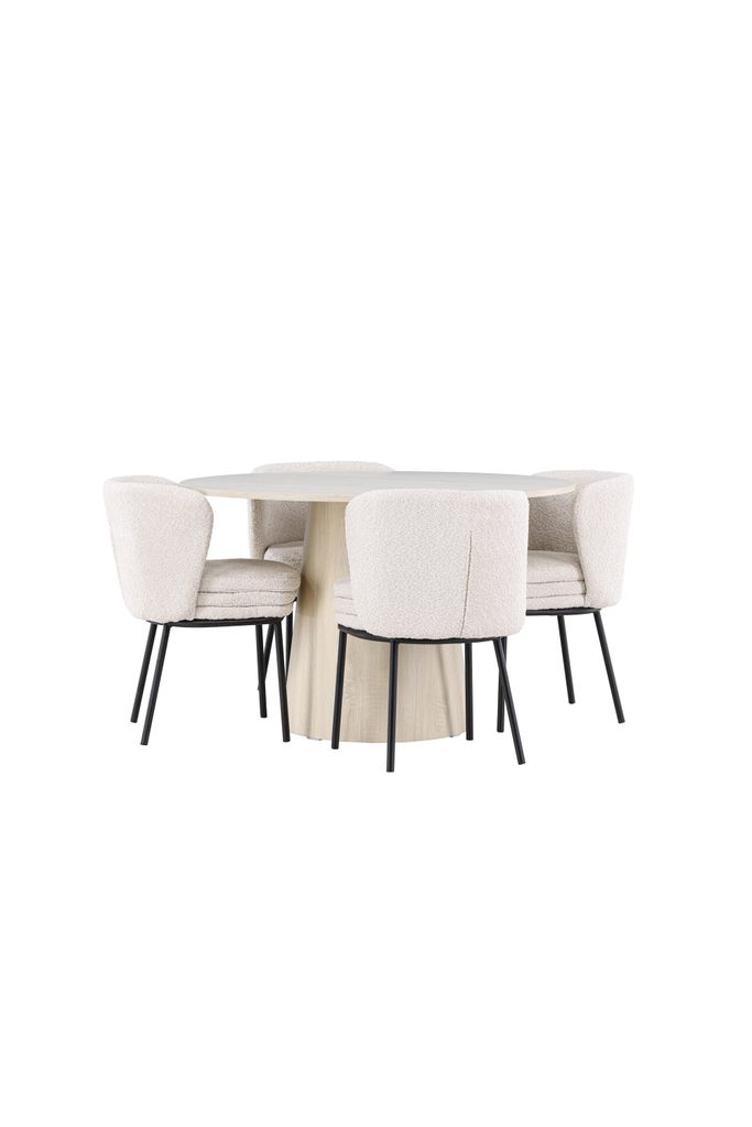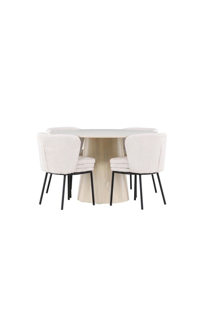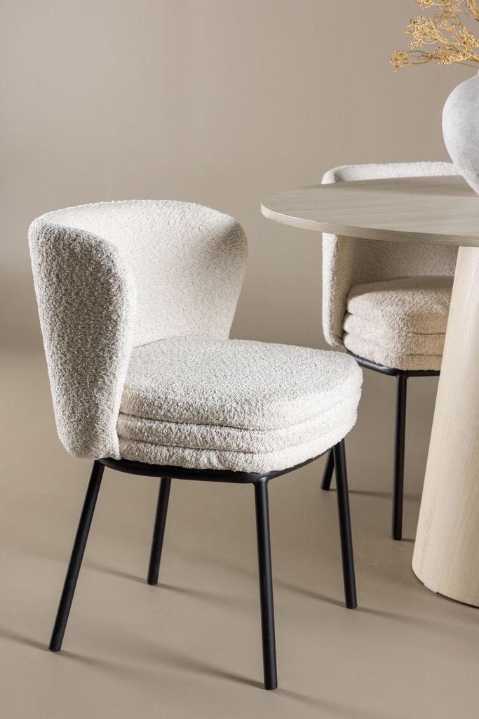 De fyra Agnes-stolarna kompletterar bordet perfekt. De har eleganta sitsar klädda i vit boucle, vilket ger både komfort och stil. Deras moderna design med hög ryggstöd och mjuka sitsar i boucle-tyg ger ditt matrum en samtida touch. Stolarna är idealiska för långa, njutbara middagar med familj och vänner.
